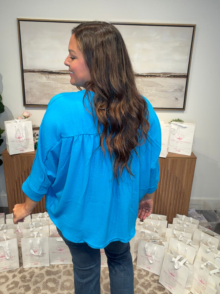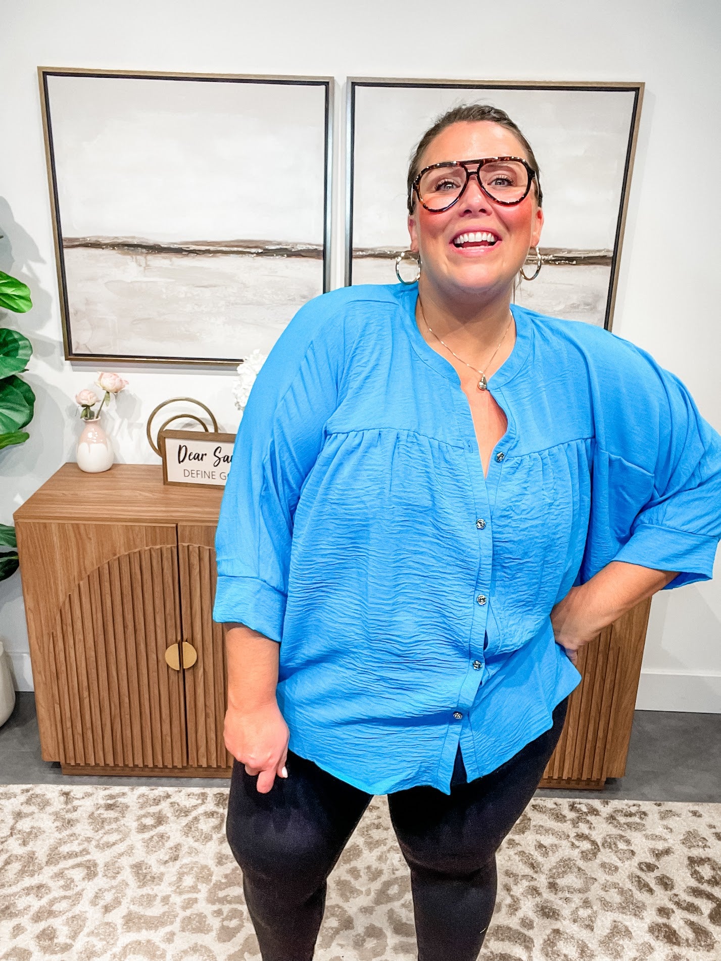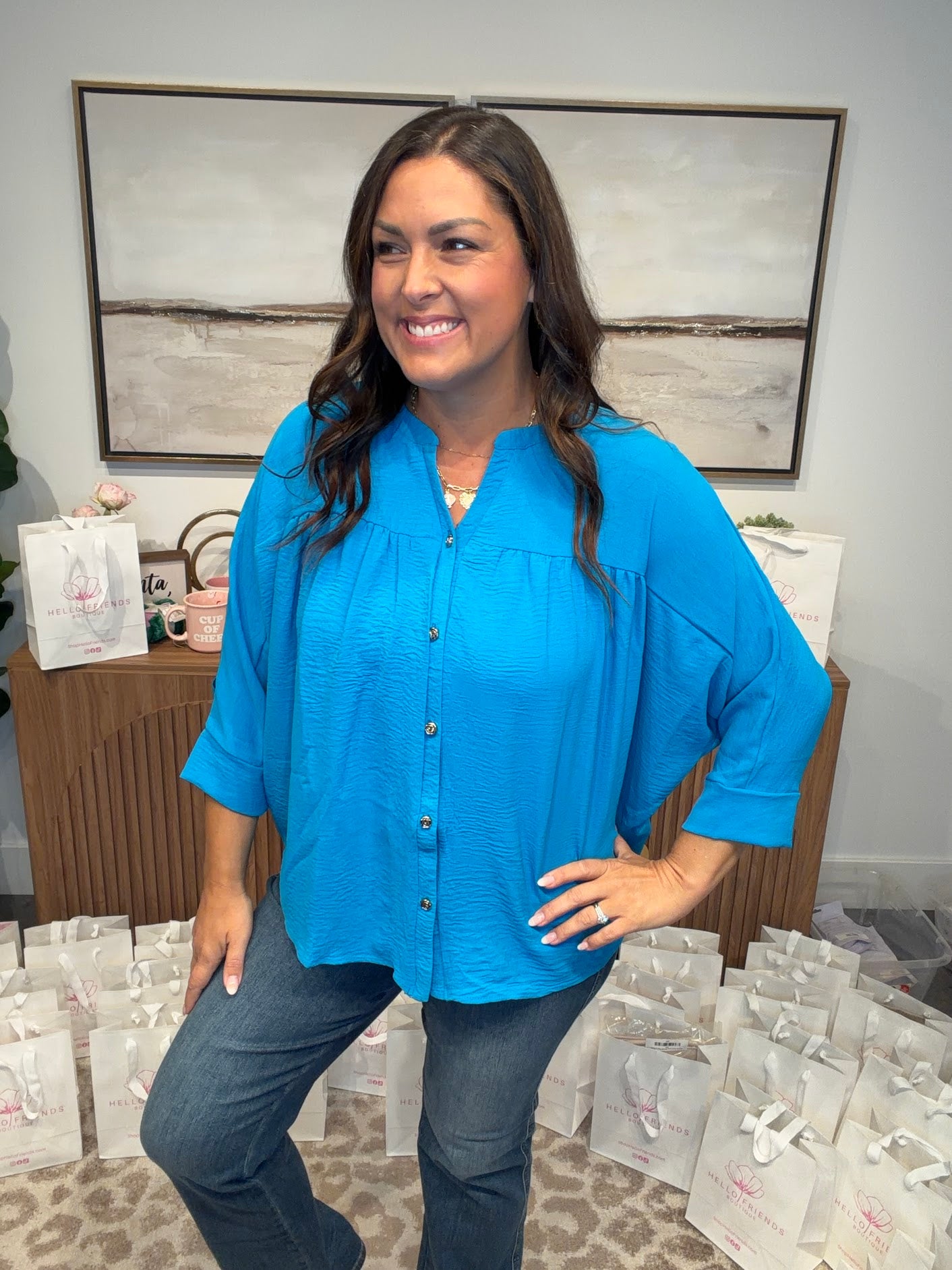 Light, airy, and effortlessly feminine — the Blossom Breeze Ruched Blouse brings soft elegance to your everyday wardrobe. Designed with a relaxed, oversized fit, this 3/4 sleeve button-down features a flattering V-neckline and delicate front ruching that adds shape without sacrificing comfort.