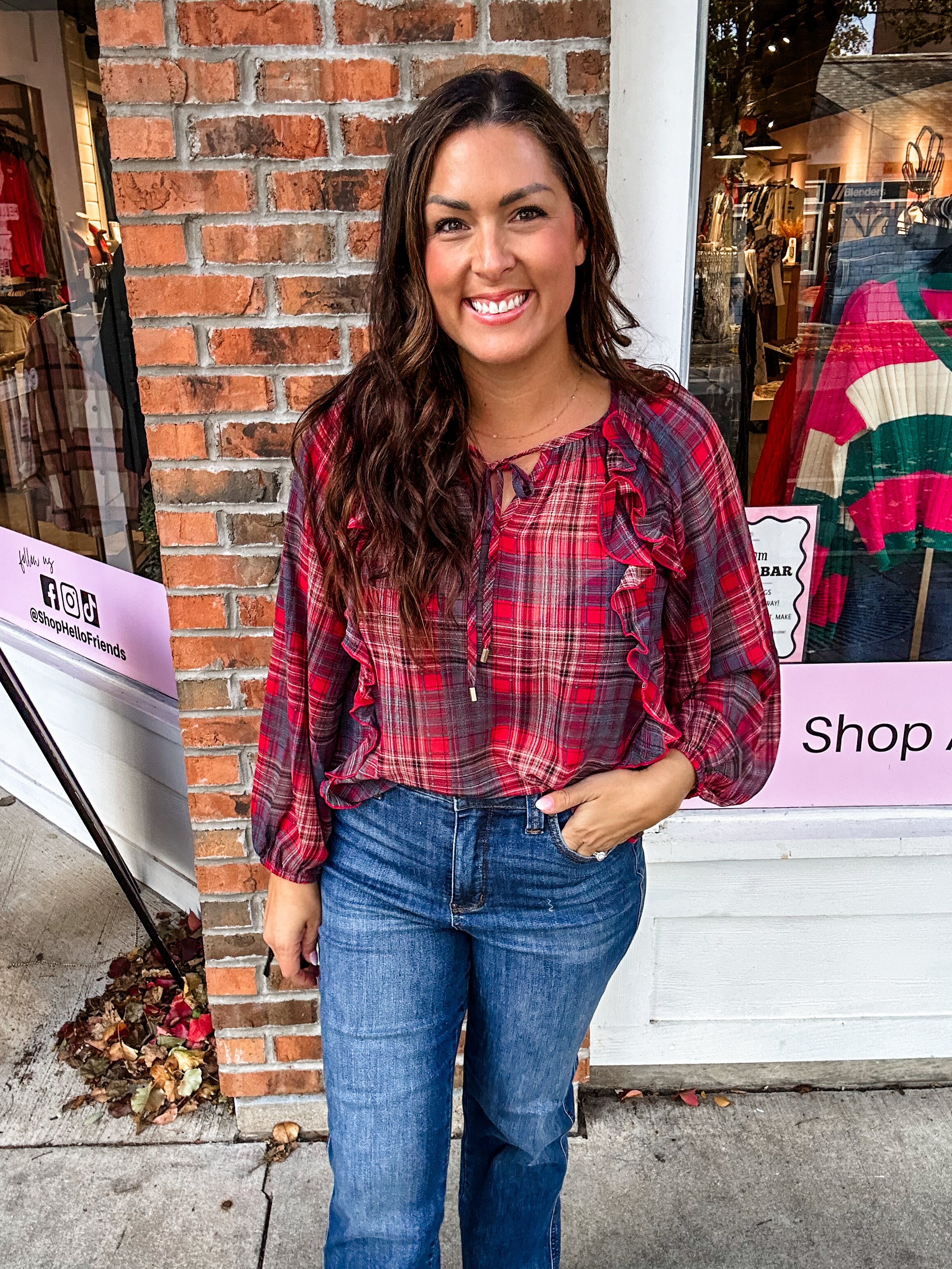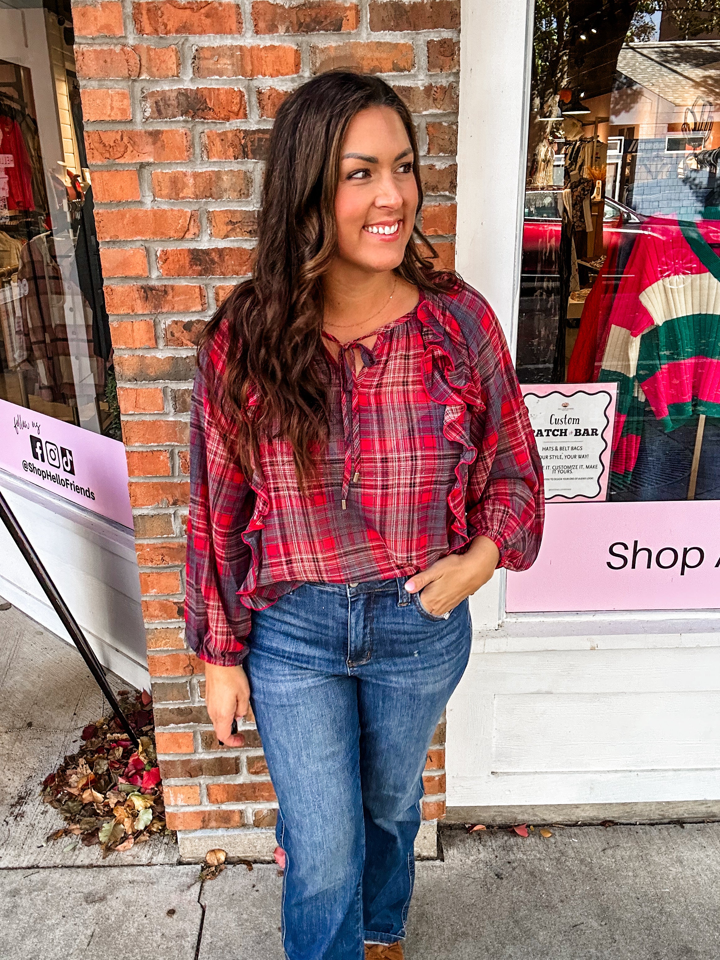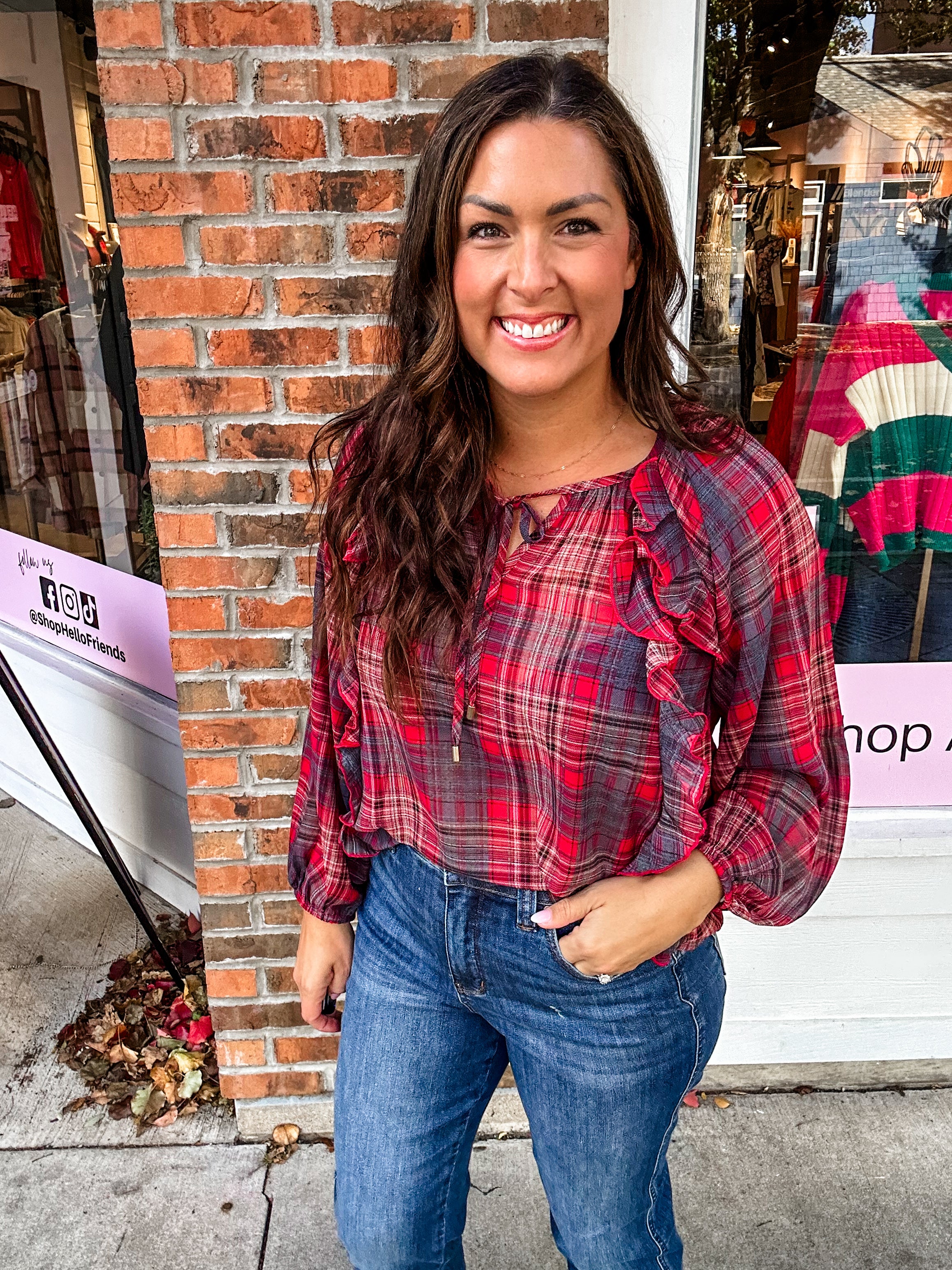 Effortlessly feminine and full of charm, the Carmine Skies Plaid Peasant Blouse features a lightweight plaid chiffon fabric, ruffle trim, and a tie neckline for a touch of romantic flair. Its long sleeves and relaxed fit make it a versatile piece for layering or wearing on its own, perfect for seasonal transitions and everyday style.