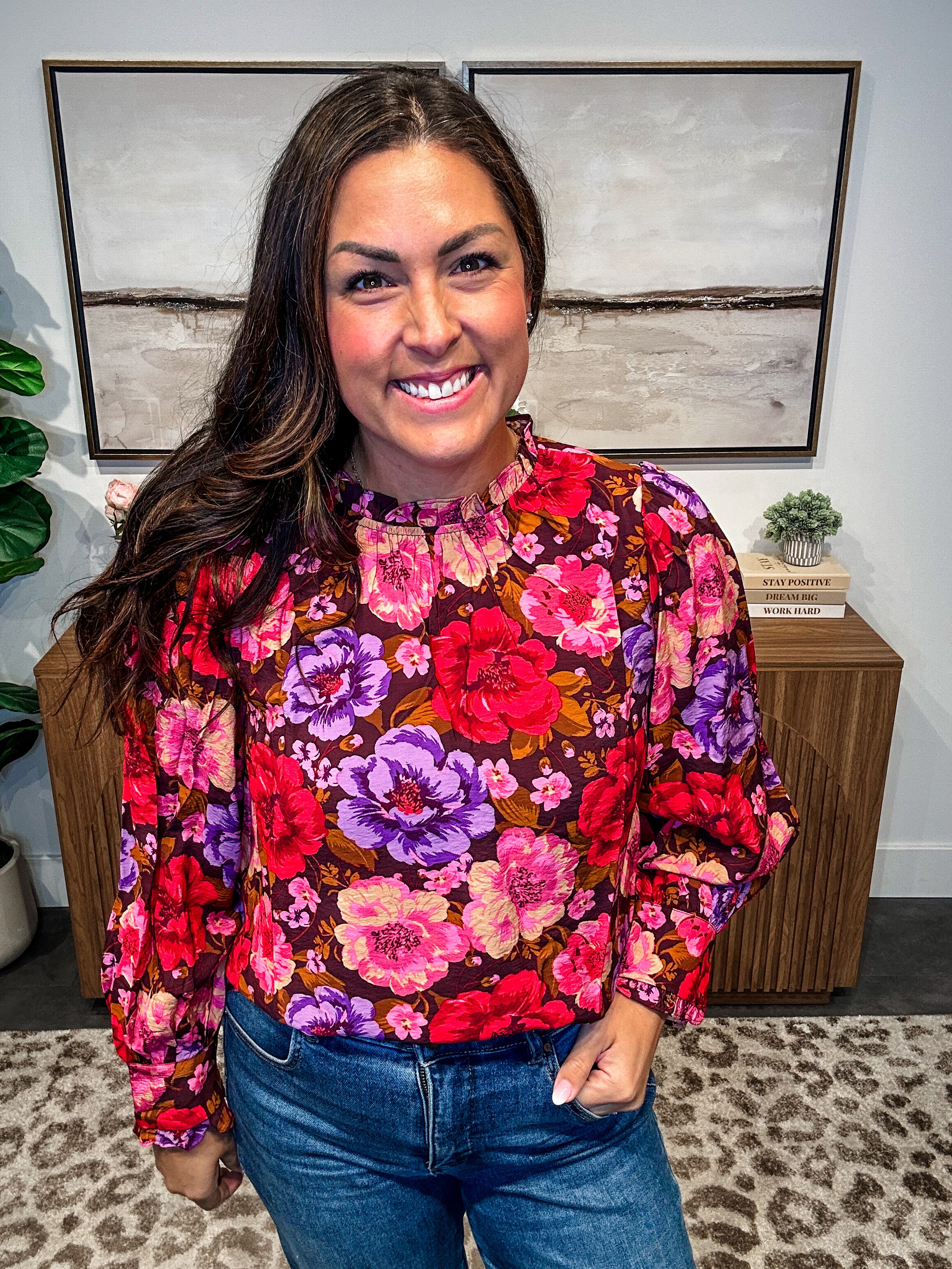 Make a statement in the Petal Cascade Chiffon Blouse, featuring a bold floral print, gathered neckline, and long sleeves with buttoned cuffs. The lightweight, flowing chiffon fabric adds elegance and movement, while the relaxed fit ensures all-day comfort. Perfect for work, brunch, or special occasions, this blouse brings a touch of drama and femininity to any outfit.