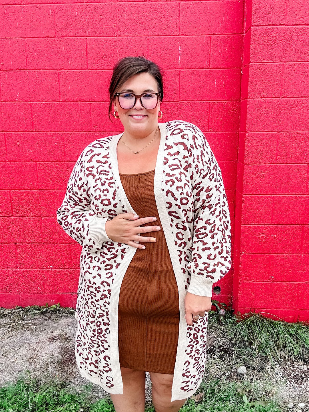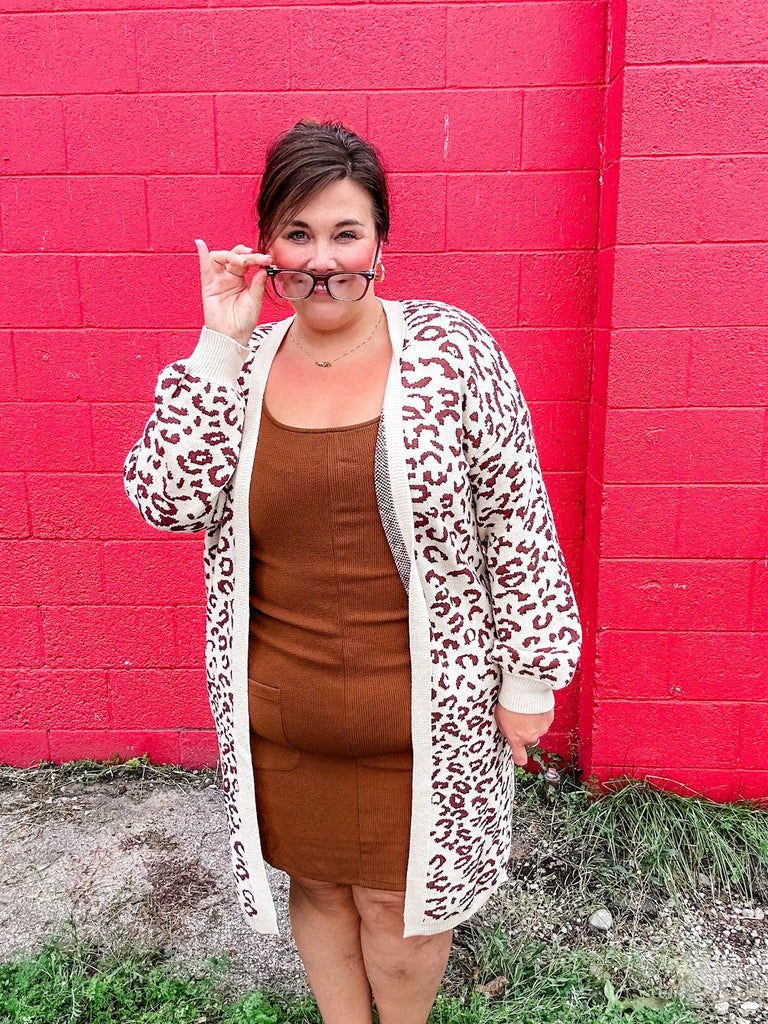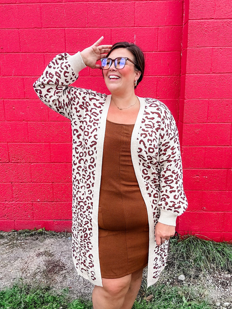 Bring a touch of fierce sophistication to your everyday wardrobe with the Prowl & Chill Leopard Print Knit Cardigan. Crafted with soft jacquard knitting, this open-front cardigan combines texture, pattern, and relaxed comfort for a versatile layering piece. Perfect over a basic tee, fitted dress, or even a sleek blouse, it effortlessly adds personality and dimension to any outfit. Cozy enough for everyday wear, yet bold enough to make a statement.