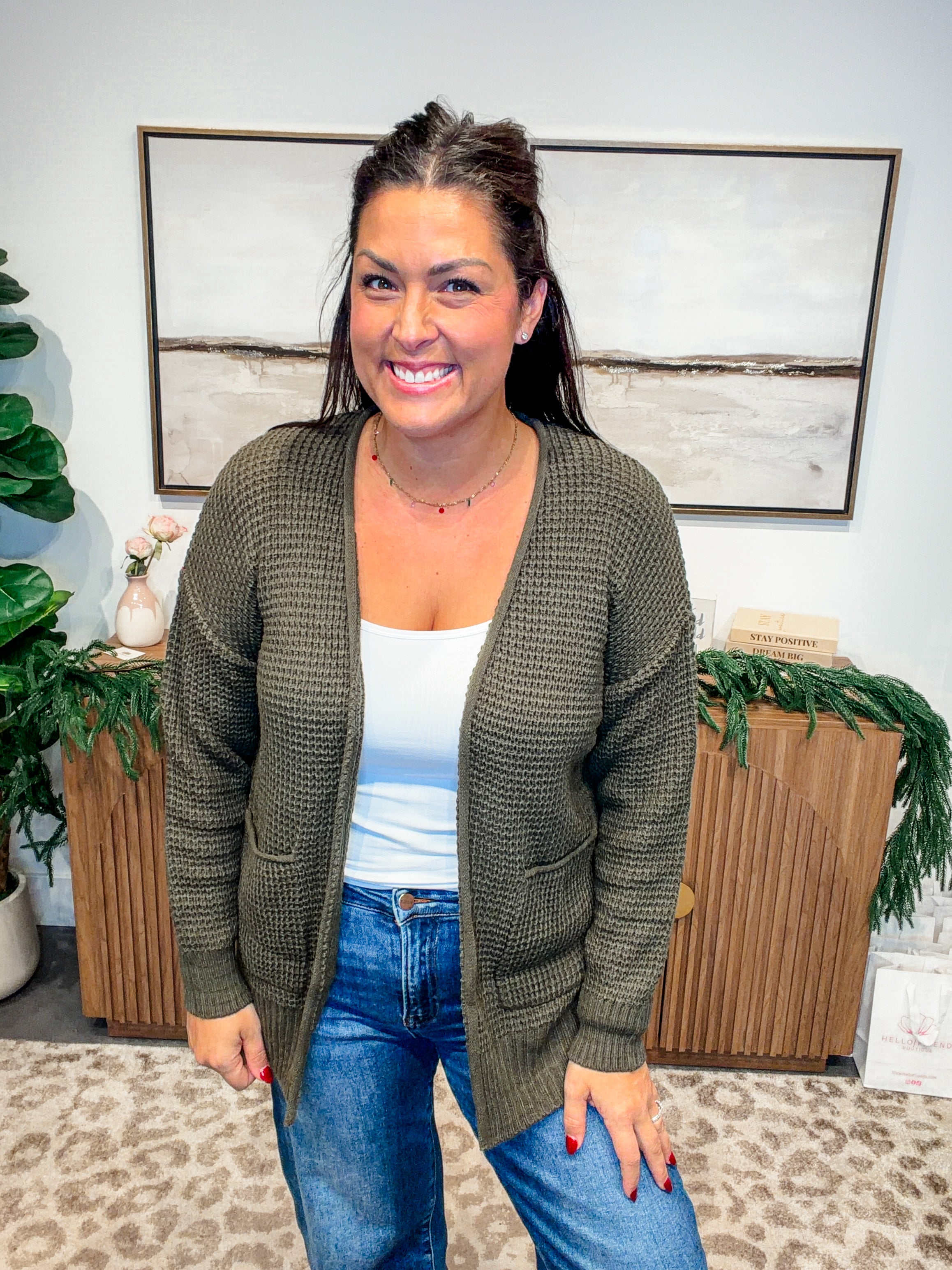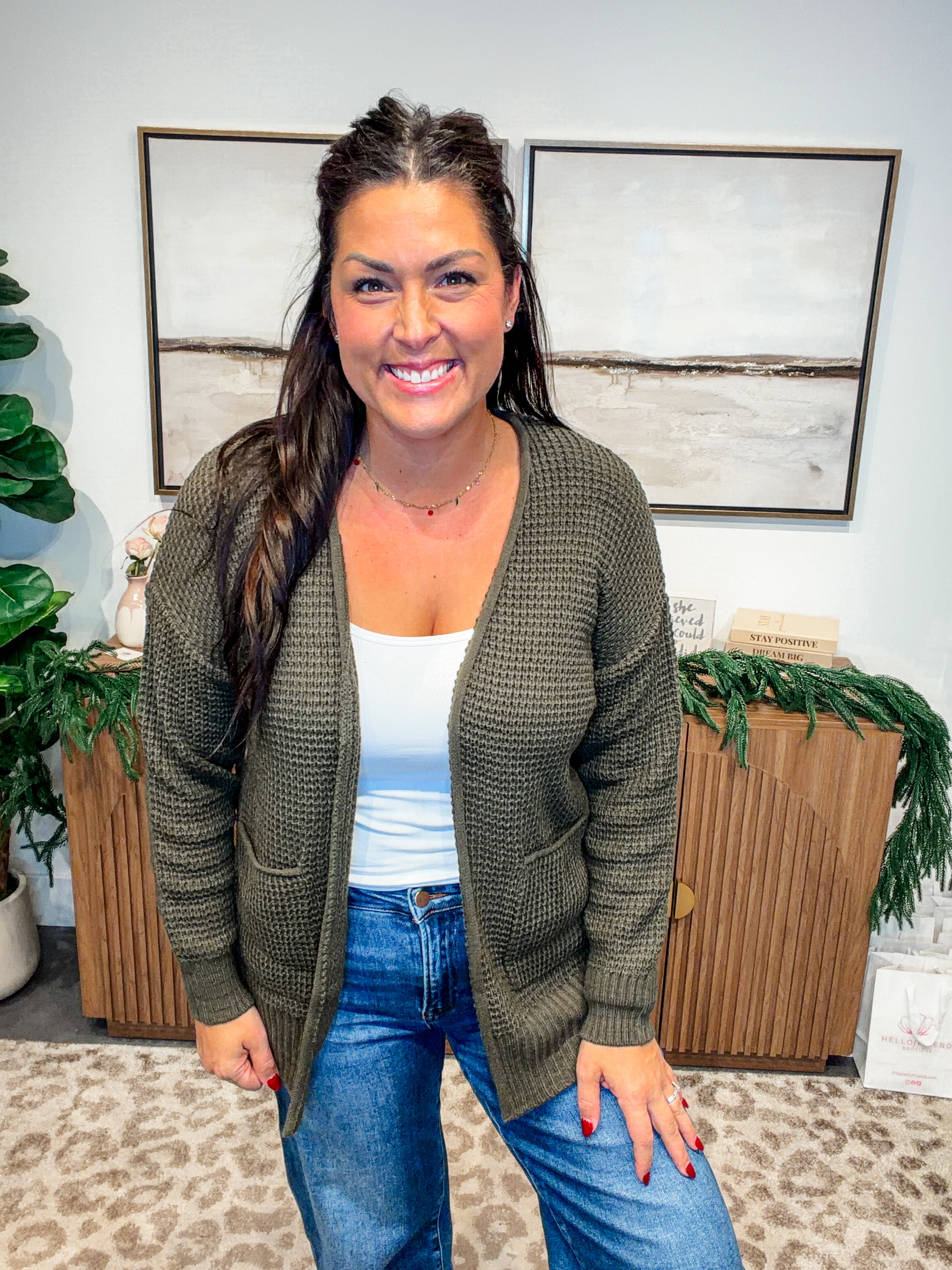 Its classic silhouette and soft waffle texture make it an easy go-to for layering over tanks, tees, or dresses, giving every outfit a polished yet laid-back feel.