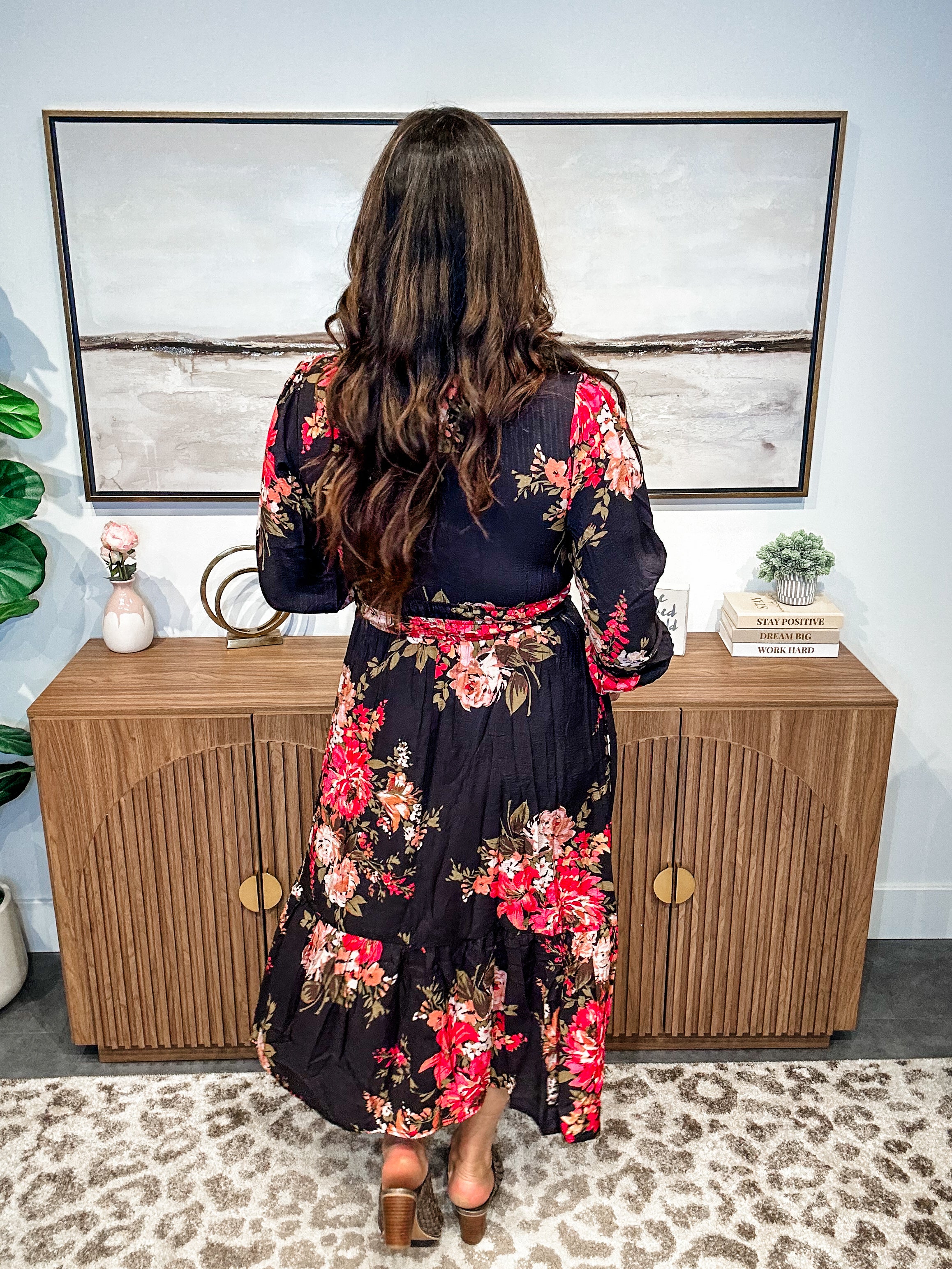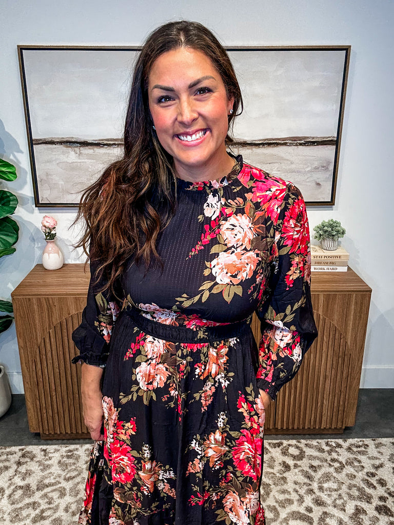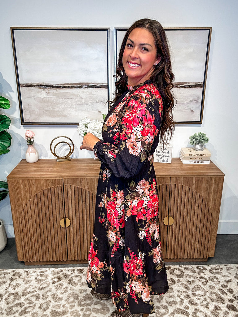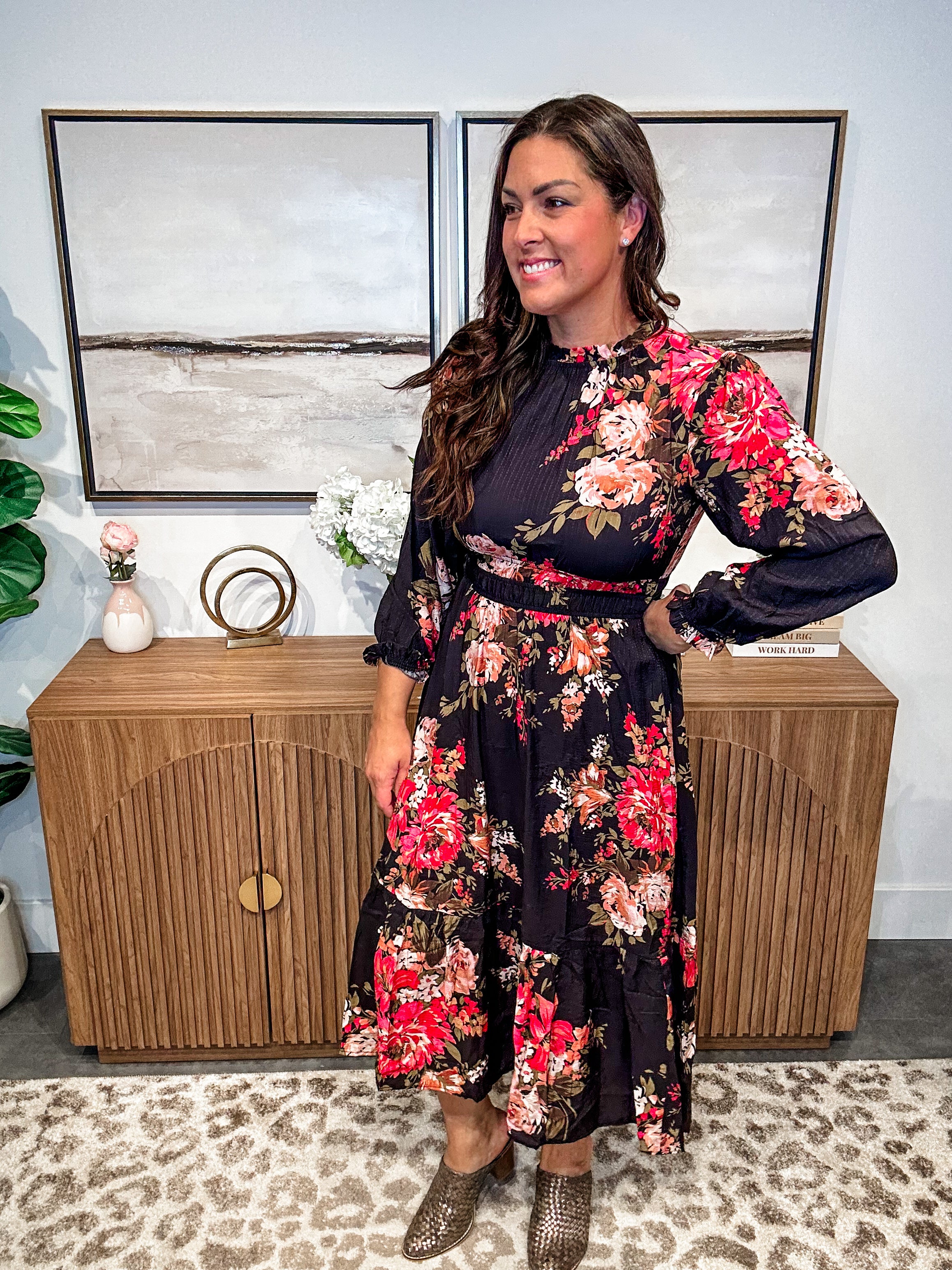 Softly romantic and effortlessly flattering, the Marigold Meadow Ruffle Midi Dress is a timeless floral favorite. Designed with a ruffled neckline, elastic waist, and tiered skirt, this dress offers the perfect blend of comfort and feminine charm. The lightweight rayon-blend fabric drapes beautifully, making it ideal for both everyday wear and special occasions.