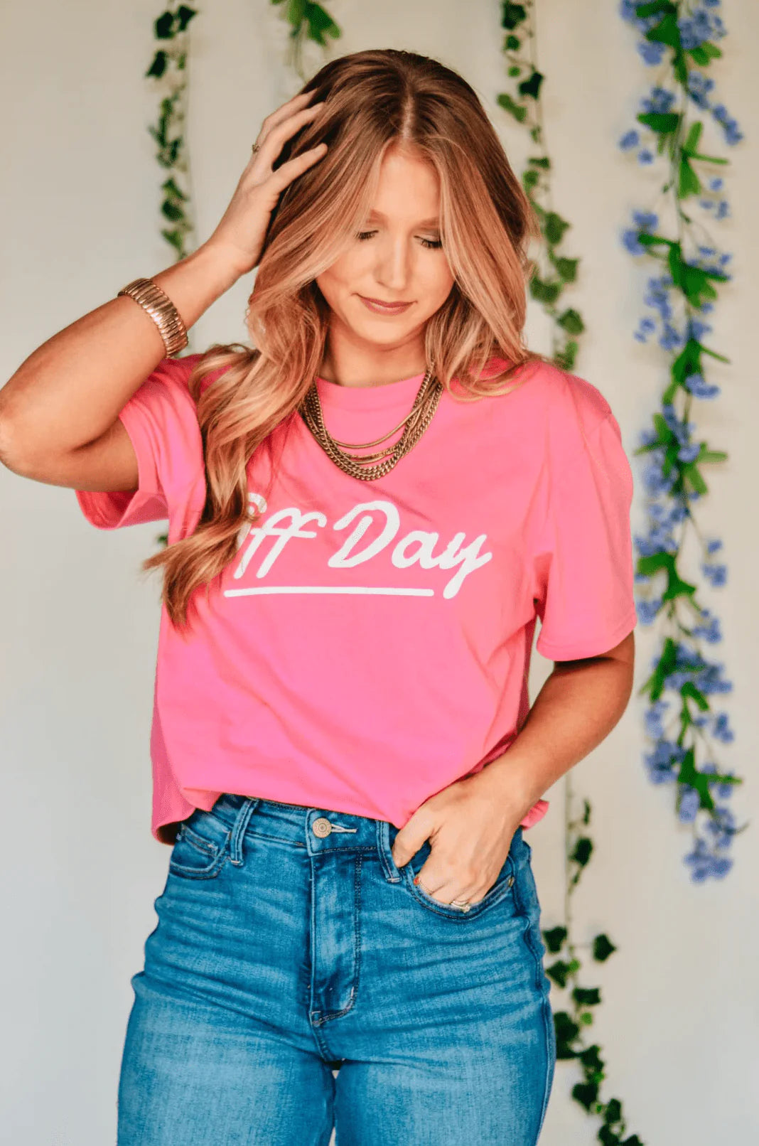 Take a break in style with our Off Day Graphic Tee! Featuring bold lettering on a vibrant hot pink backdrop, this tee is your go-to for those well-deserved days off. With its relaxed fit and soft, breathable fabric, it’s perfect for lounging, running errands, or grabbing coffee with friends.