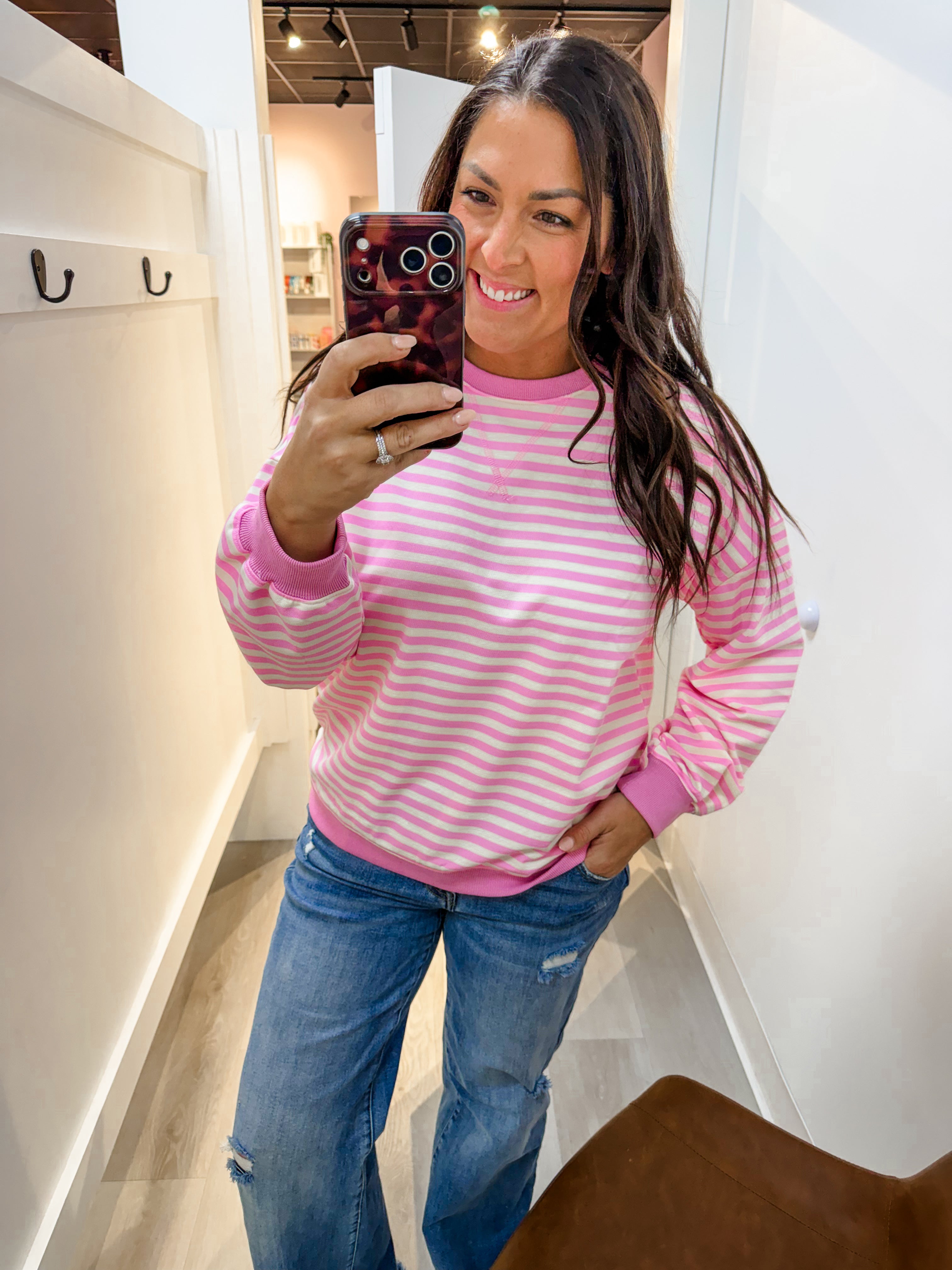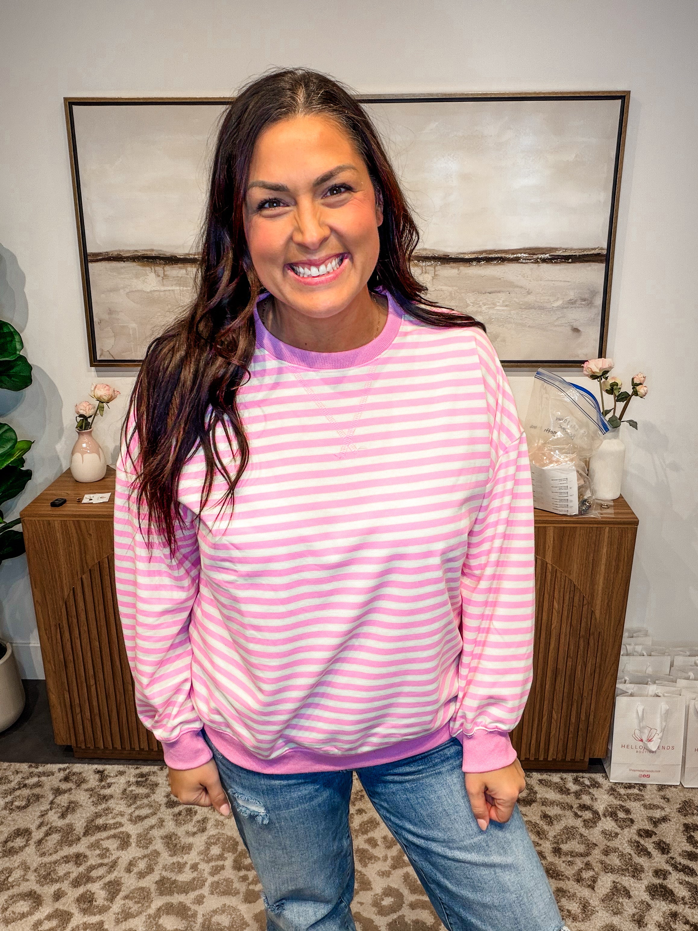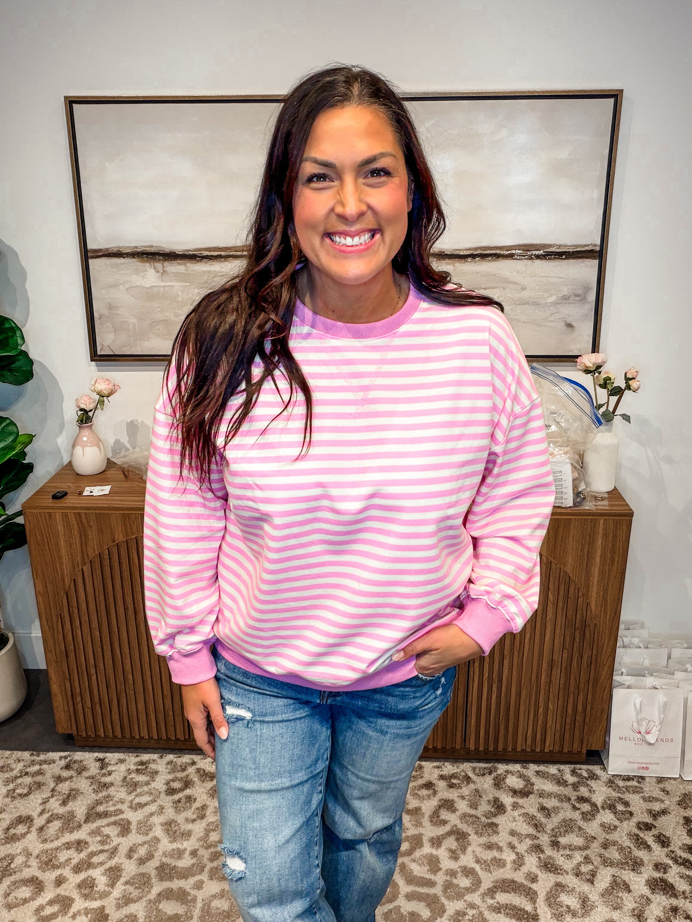 Pink Sweet Stripes Pullover Get ready to fall in love with this adorable striped pullover! The pink and white stripes are absolutely dreamy, and we're obsessed with the fit. This oversized beauty is the perfect blend of cozy and cute, with a relaxed fit that's ideal for those laid-back days when comfort is everything.