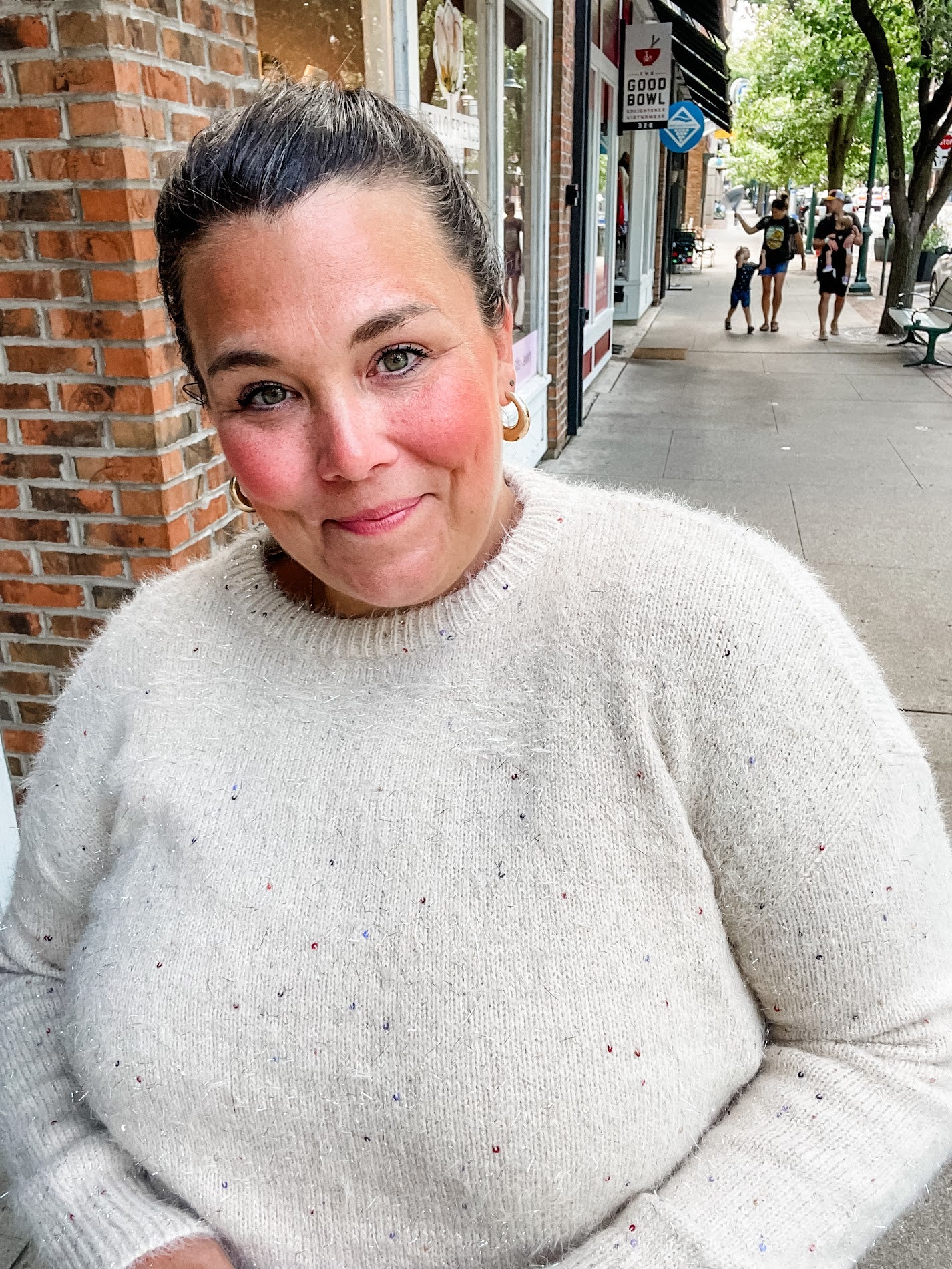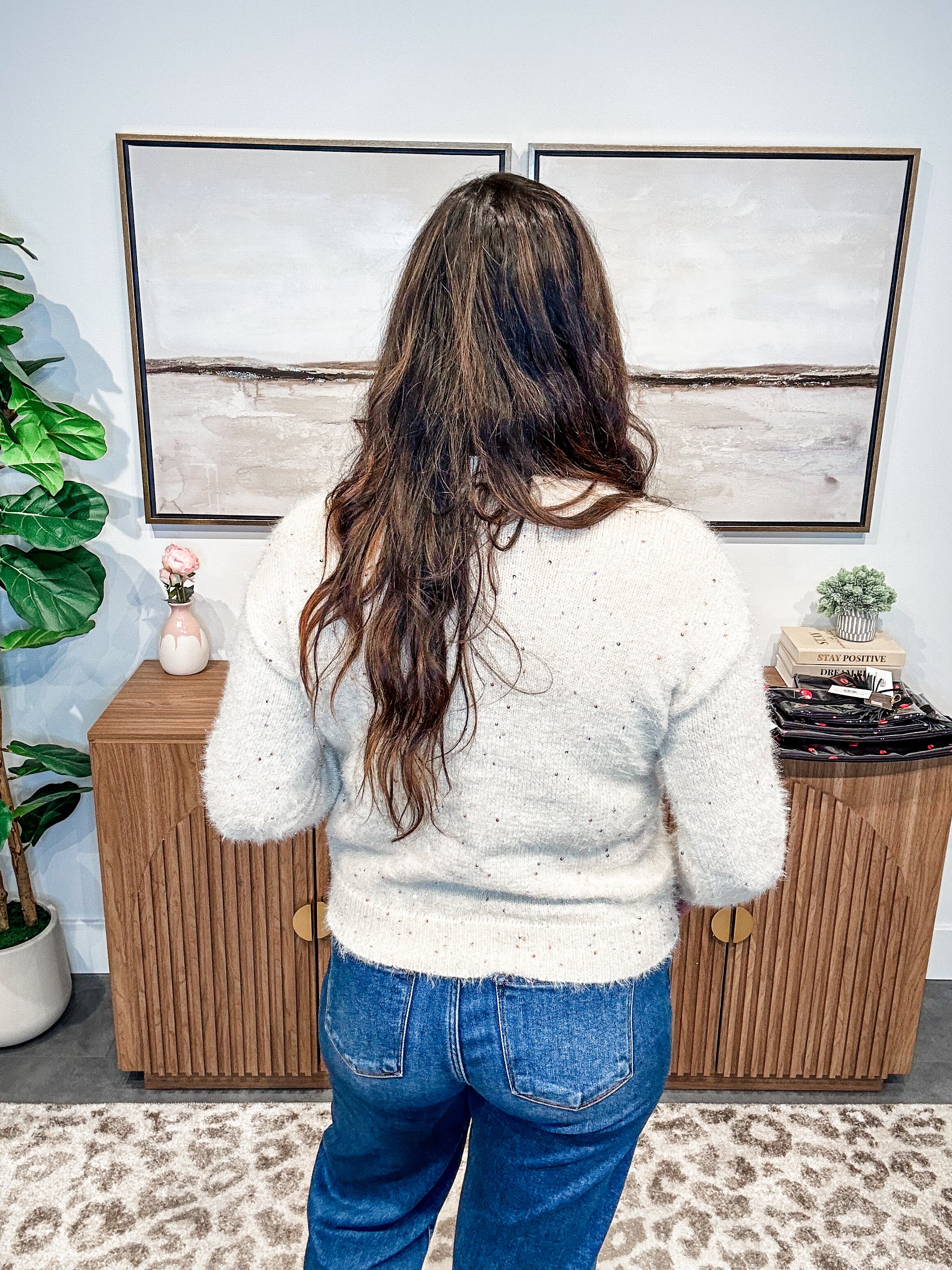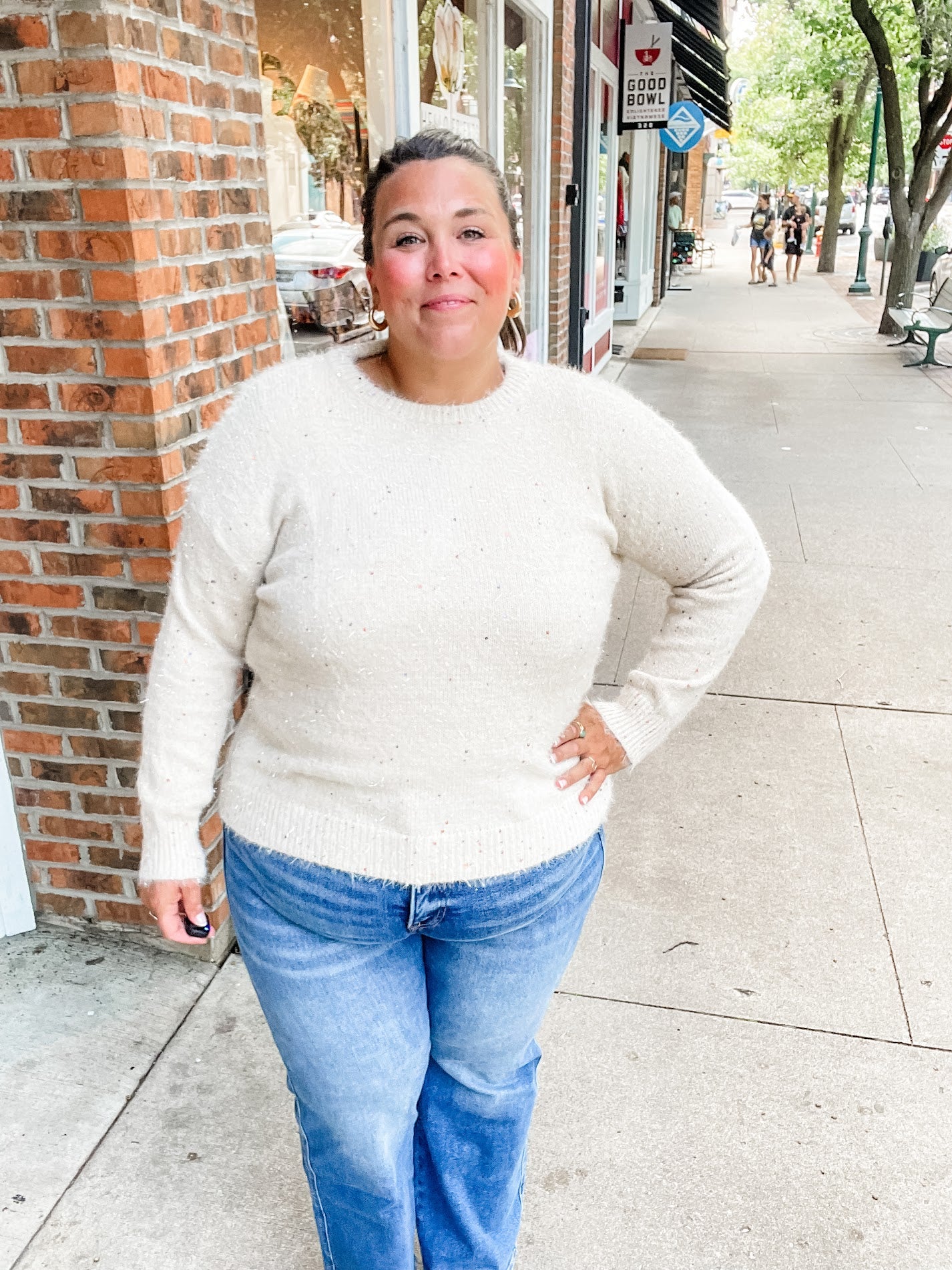 Add a little sparkle to your everyday wardrobe with the Happy Threads Pullover Sweater. Its soft, fuzzy knit wraps you in comfort, while subtle multicolor specks bring a playful, eye-catching touch. With a classic crew neckline and relaxed fit, it’s the ultimate layering piece for chilly days, casual brunches, or cozy nights in. Whether tucked into your favorite jeans or layered over leggings, this pullover effortlessly combines comfort, charm, and a hint of whimsy.
