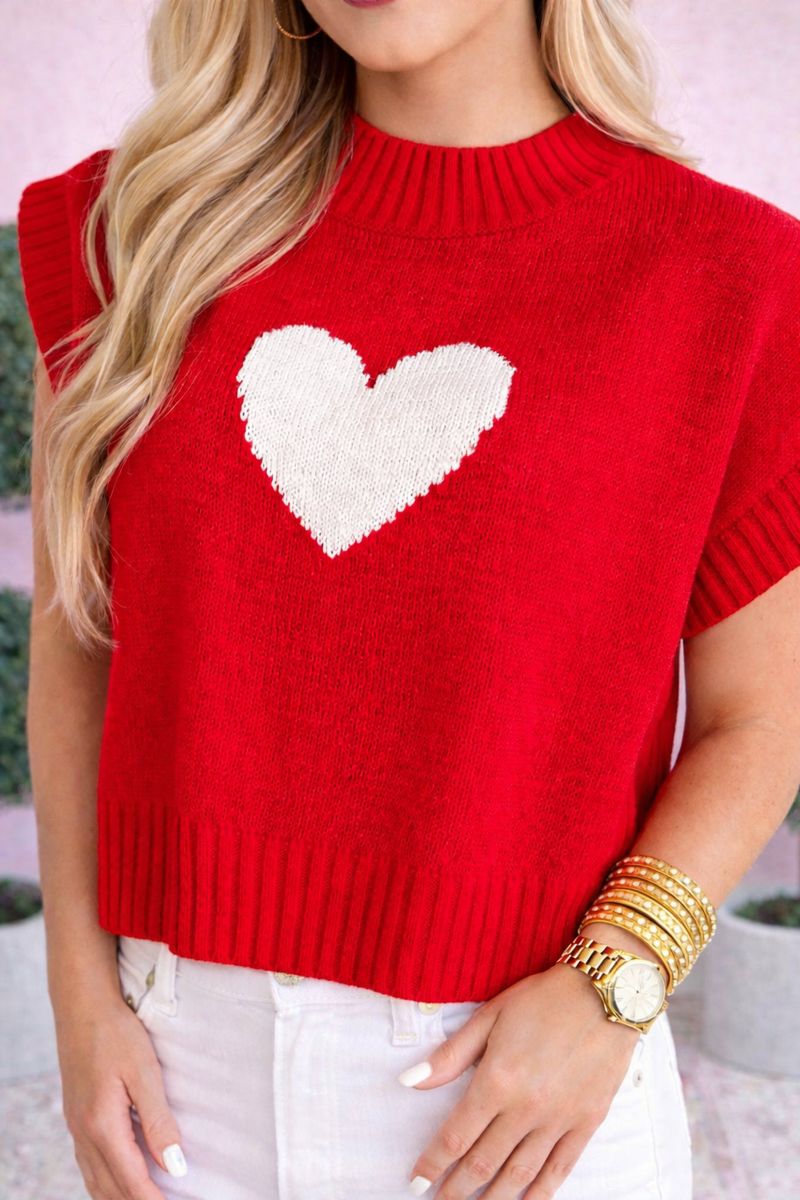 The Heart Eyes Boxy Knit Top features a bold red base with a crisp white heart front and center — simple, playful, and totally effortless. Designed with a relaxed, boxy fit and short sleeves, this top is comfy enough for all-day wear while still making a statement.