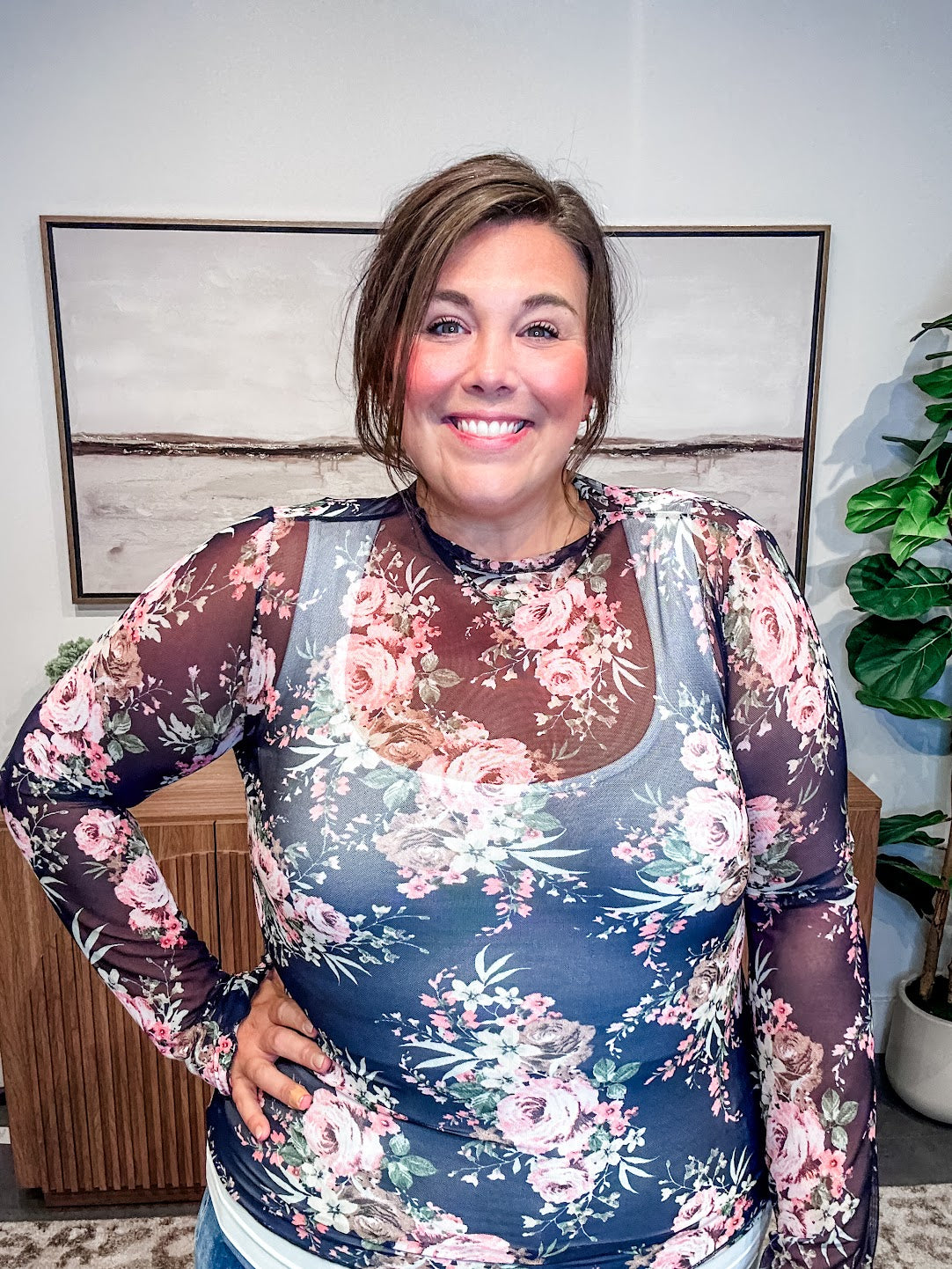 Elevate your wardrobe with the romantic elegance of this High Neck Floral Mesh Top. Crafted from a lightweight, semi-sheer mesh, it features an allover floral print and a delicate frilled merrow hem for added movement and charm. The high neckline and long sleeves make it perfect for layering or styling on its own for a standout look. Feminine yet edgy, this top brings effortless sophistication to your casual and dressy ensembles alike.