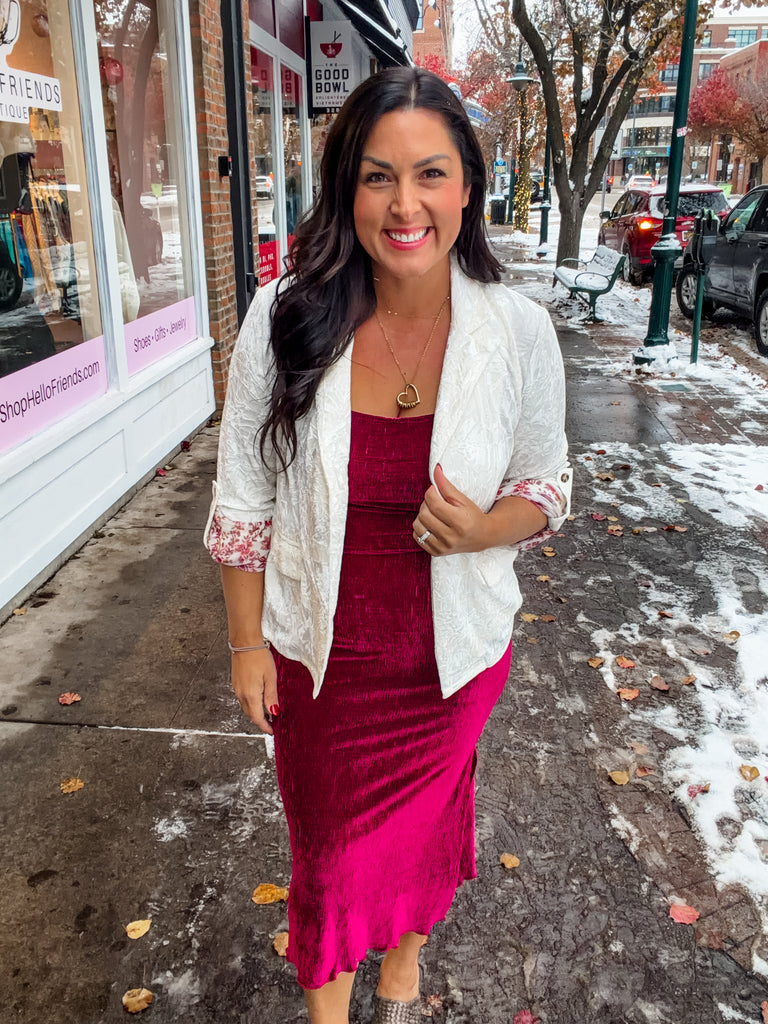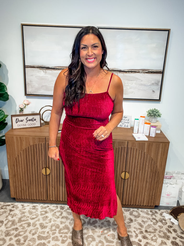 Dress it up with sparkly heels, a clutch, and statement earrings for evening glam, or keep it sleek and simple with nude heels and a tailored coat. This velvet beauty is ready for every celebration.