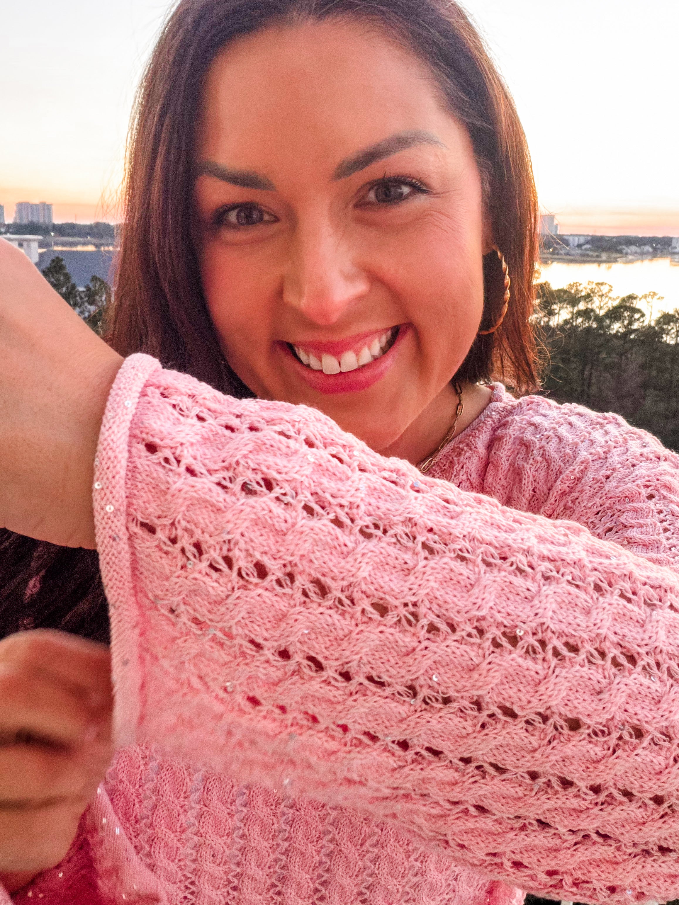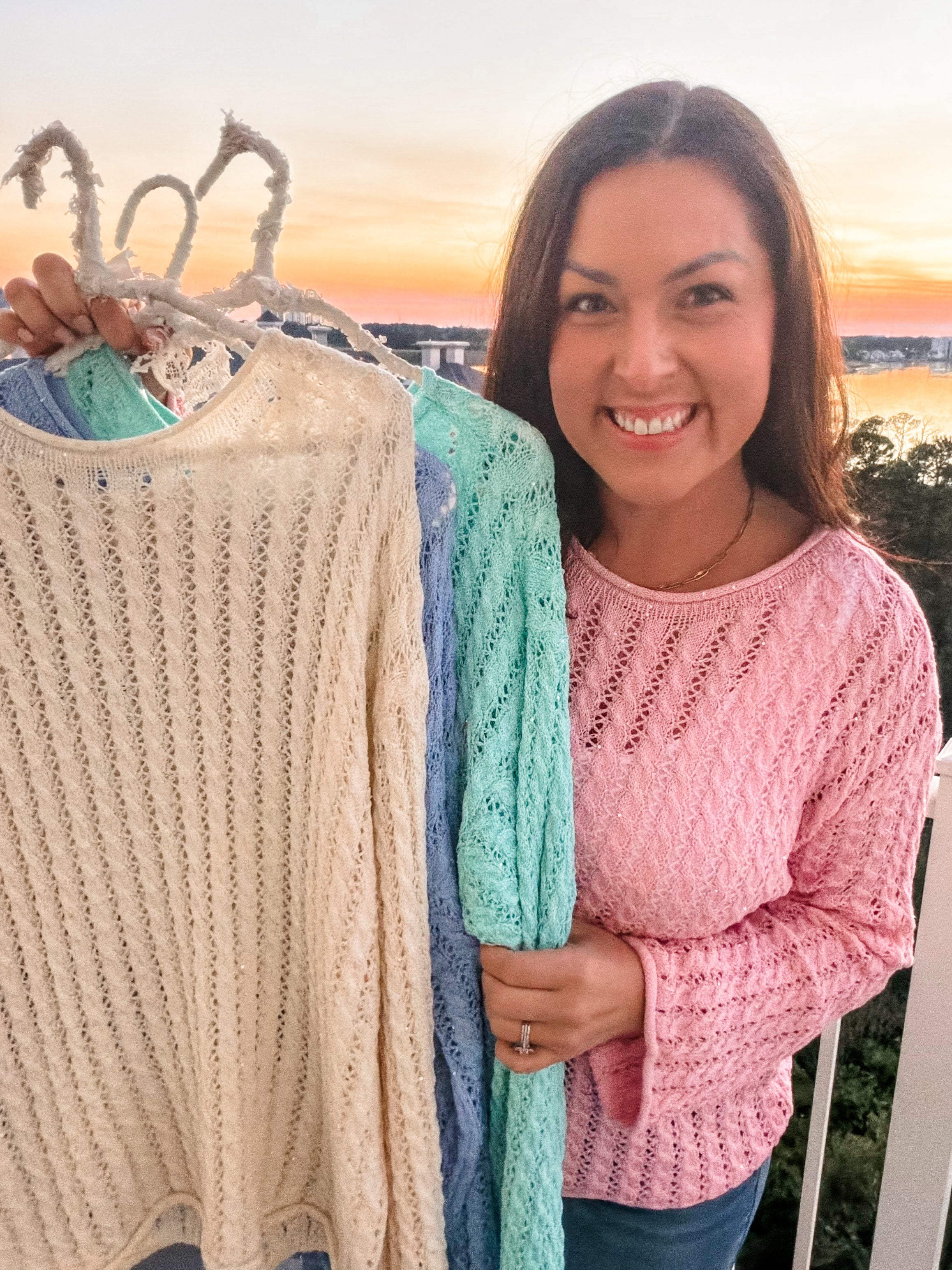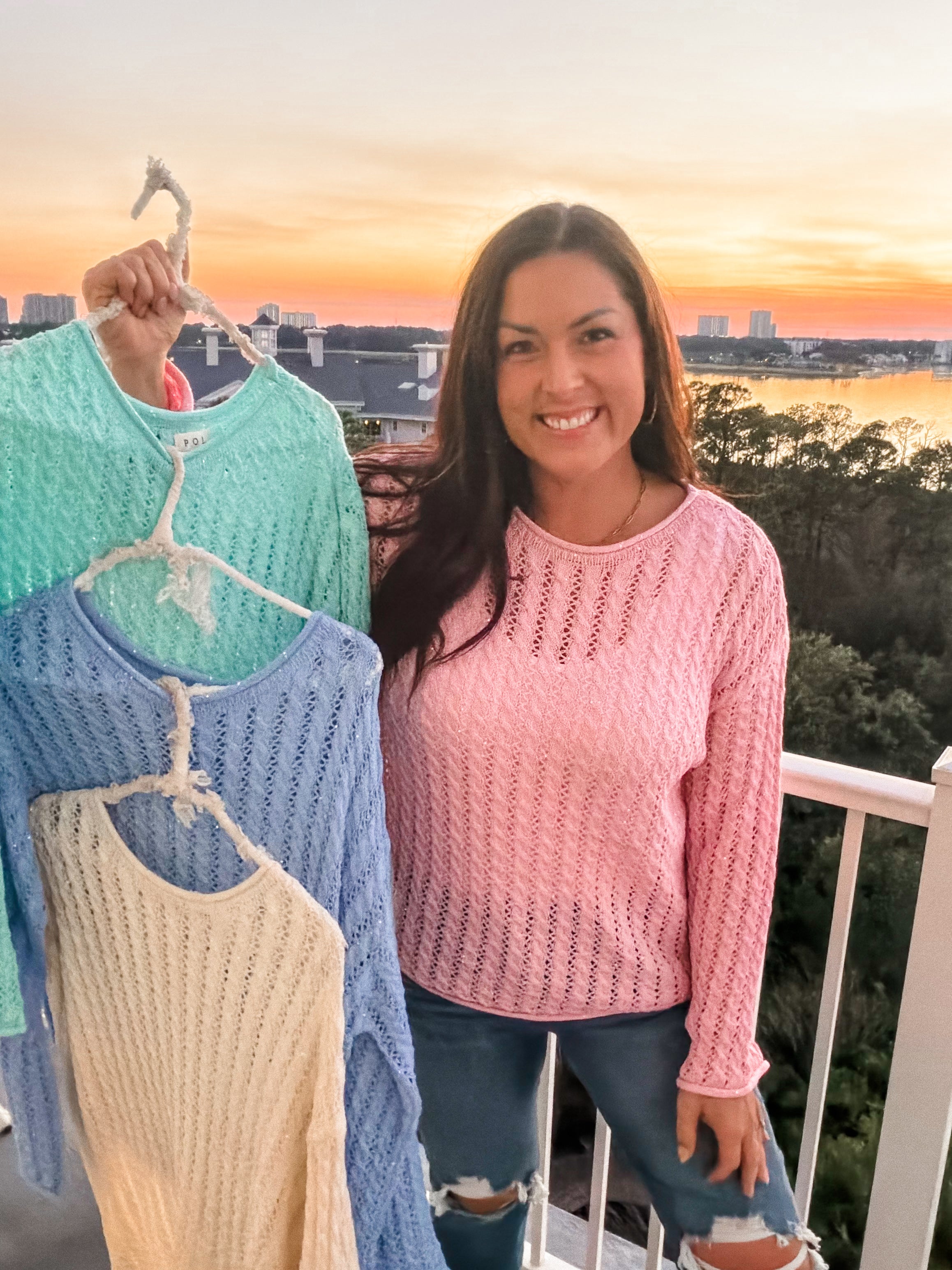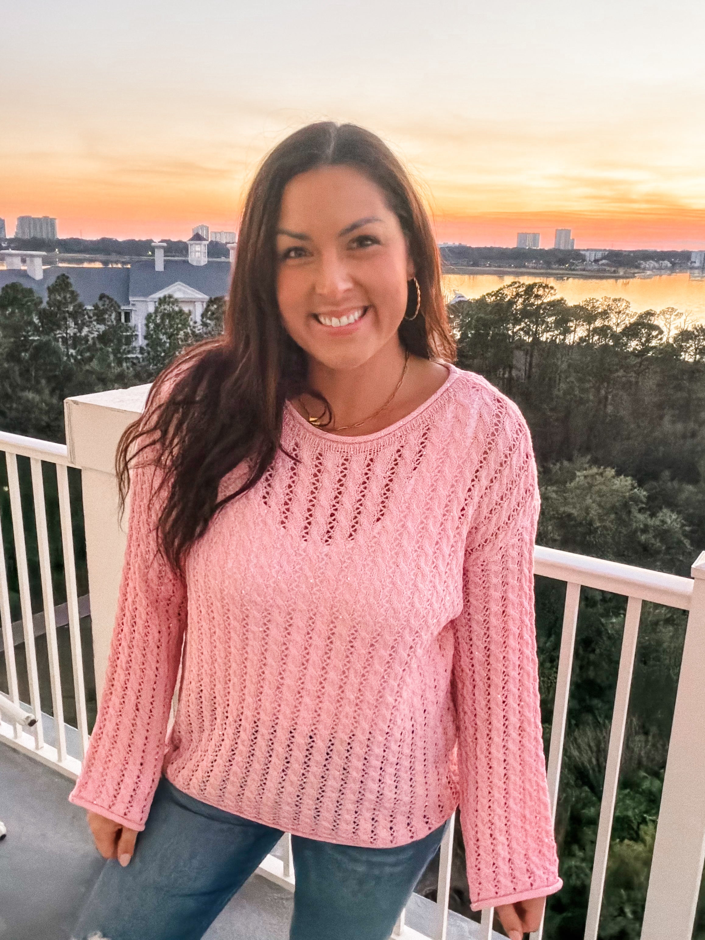 Get ready to sparkle in this absolutely gorgeous open-knit sweater! We're obsessed with the delicate sequins scattered throughout that catch the light beautifully - it's like wearing a little bit of magic! Available in four dreamy colors (pink, aqua mint, blue, and ivory), this sweater is the perfect blend of cozy and glamorous.