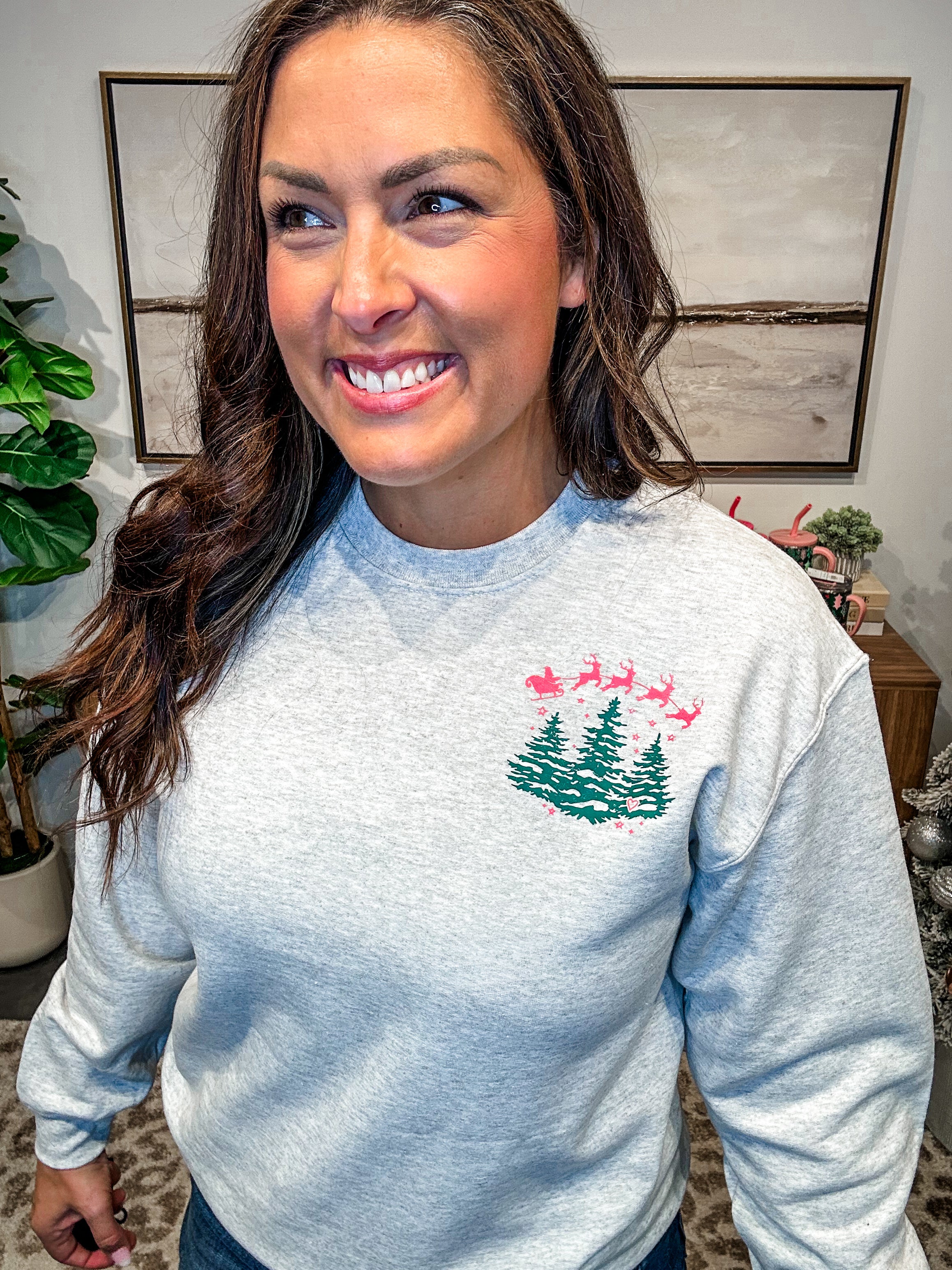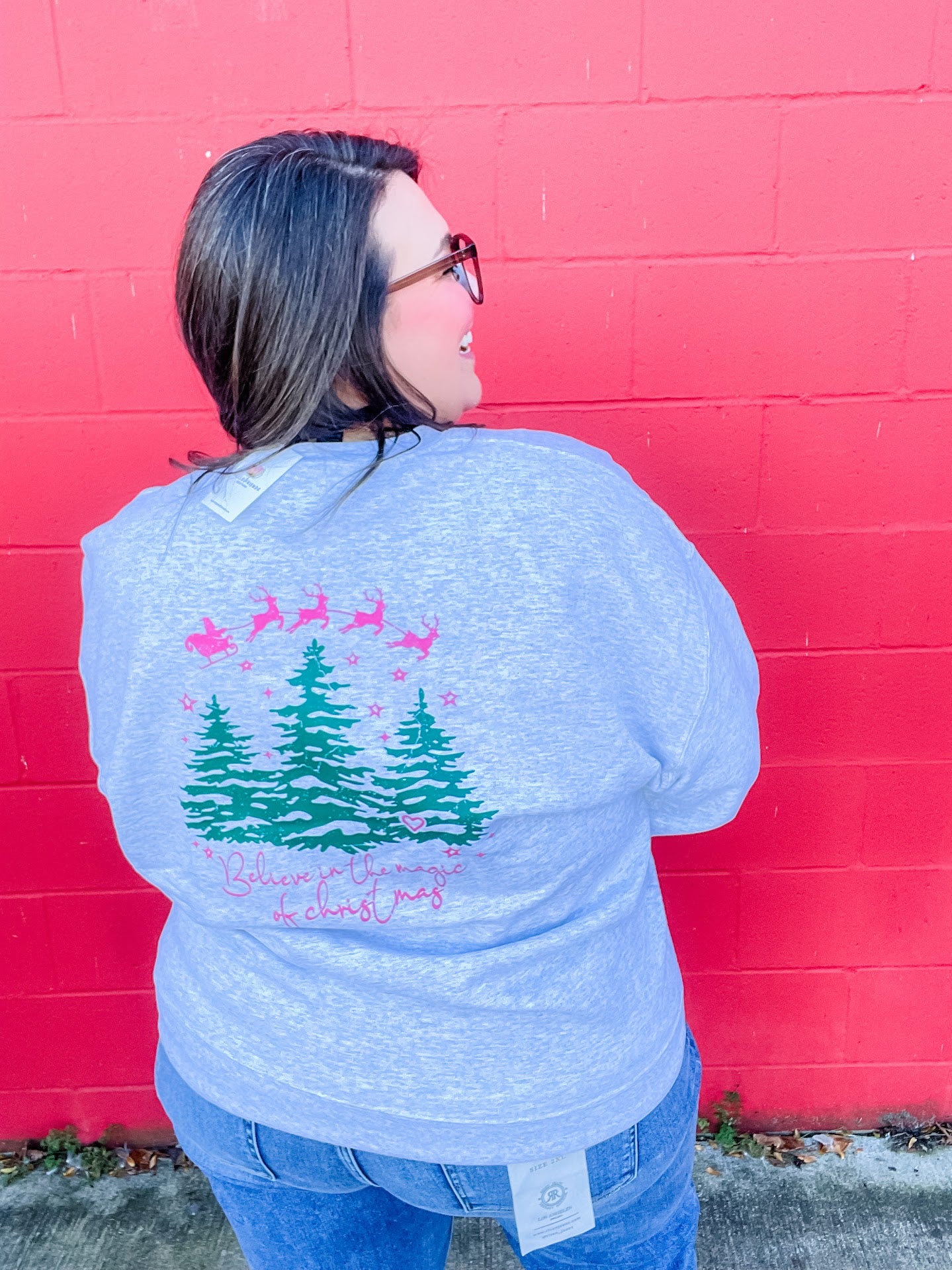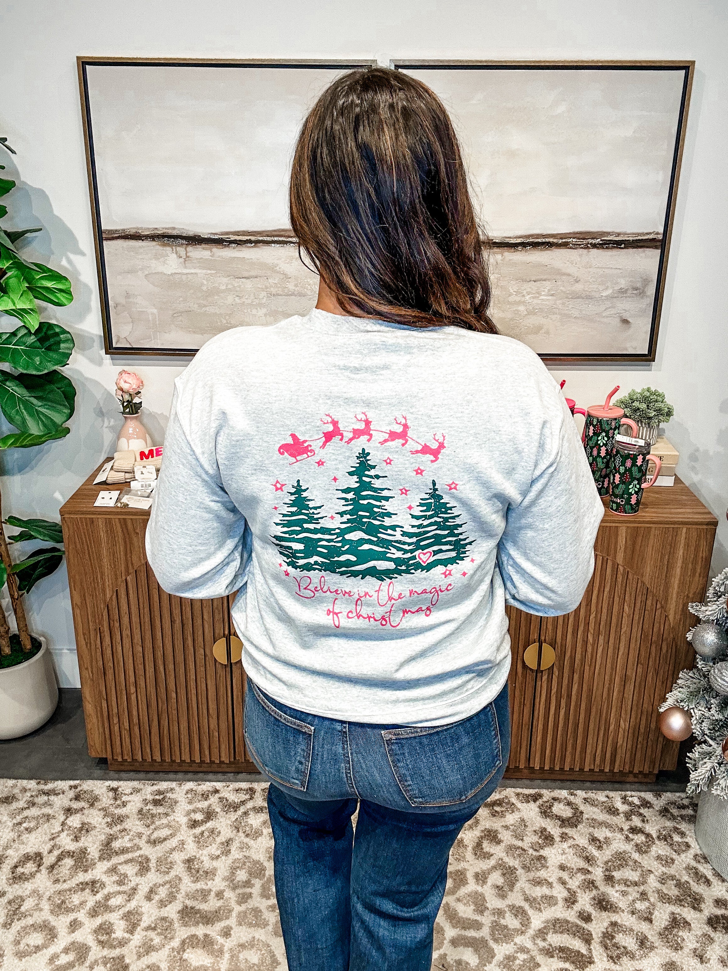 Celebrate the season with cozy charm in our Believe In The Magic Of Christmas Sweatshirt. Featuring a playful Santa and tree graphic surrounded by wintery snow accents, this sweatshirt is a festive favorite that spreads holiday cheer wherever you go. Crafted from a soft cotton/polyester blend, it’s designed for comfort, warmth, and long-lasting wear.