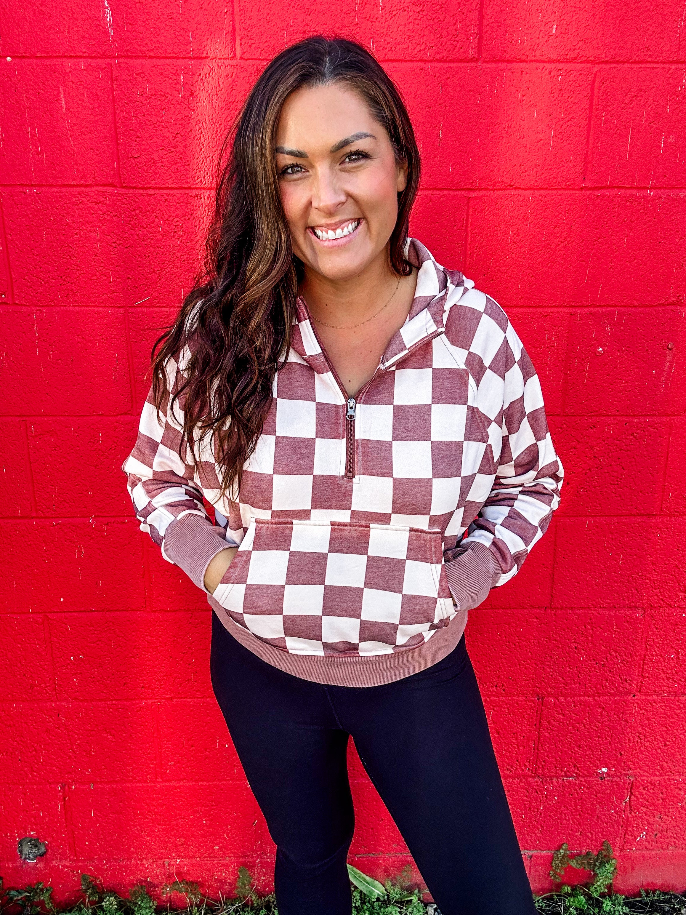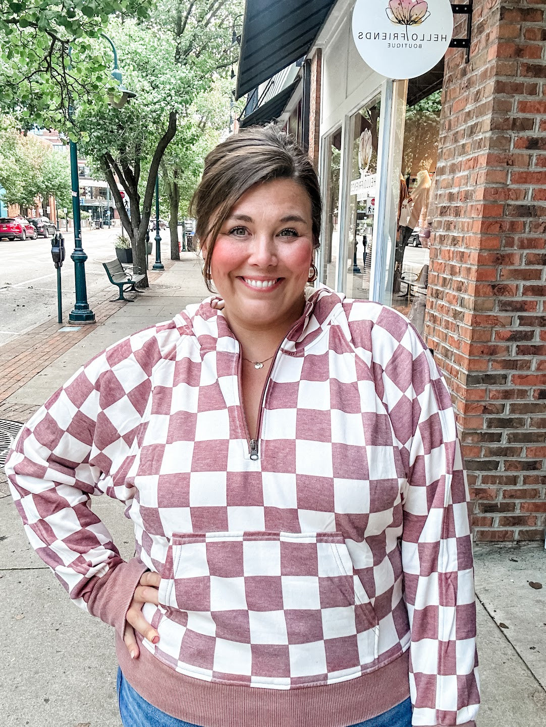 Step into effortless style with our Easy Does It Pullover, featuring playful camo and checker prints for a trendy twist on a classic hoodie. Crafted from soft, high-quality fabric, this semi-cropped pullover hits just right—covering the belly and sitting slightly past the waist. Its relaxed fit makes it perfect for layering, lounging, or running errands in comfort. Thumbholes add a sporty touch while keeping your hands cozy on cooler days. Practical, cute, and effortlessly cool—this hoodie truly does it all!