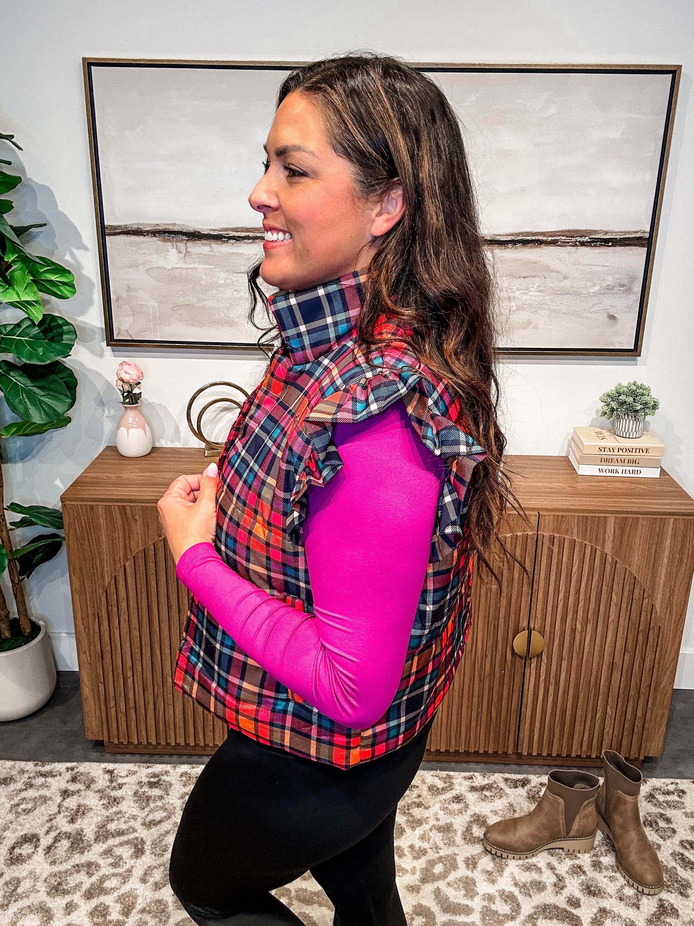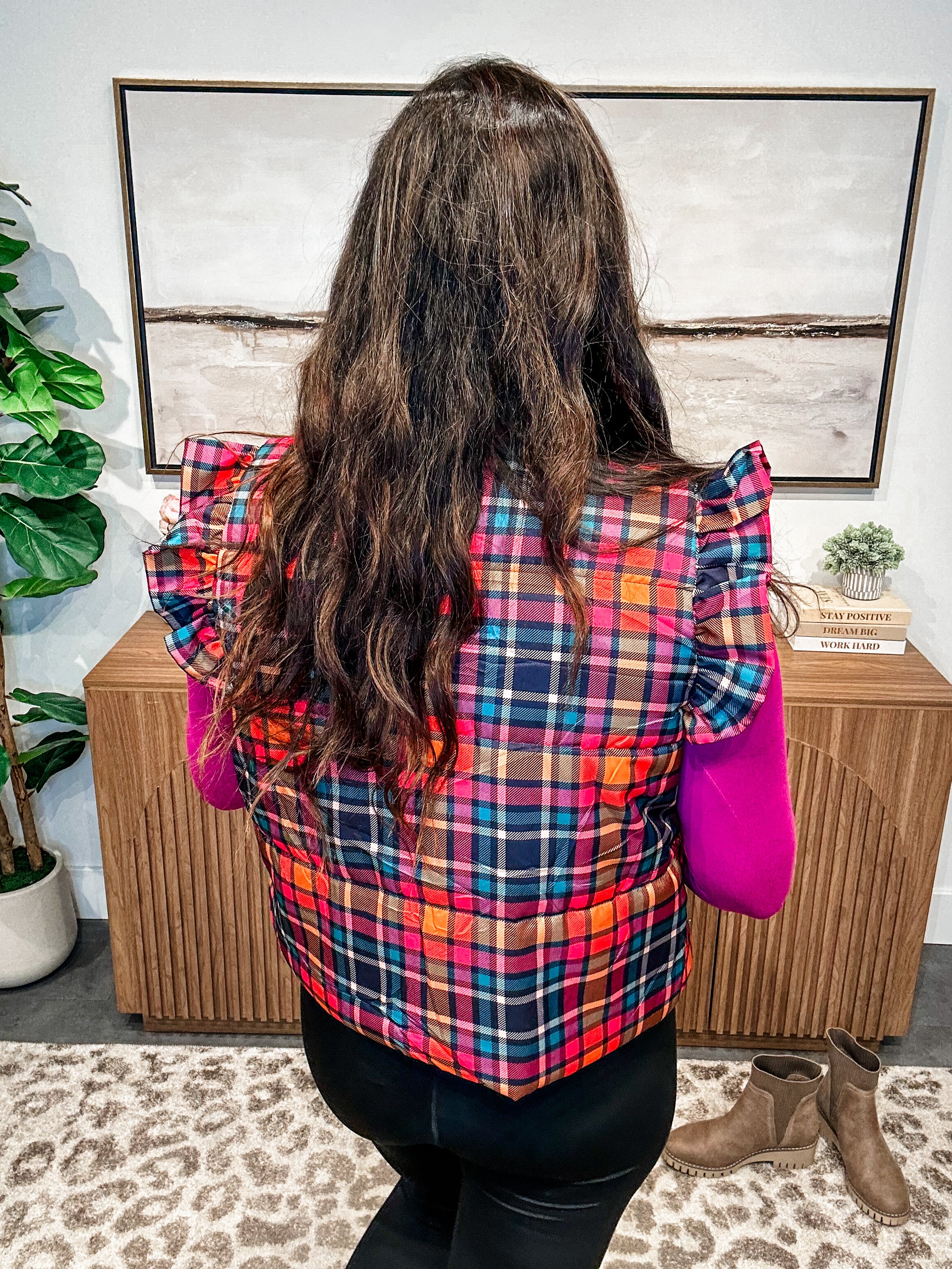 Wrap yourself in cozy charm with the Patterned in Plaid Puffer Vest — where timeless plaid meets modern femininity. This vest features subtle ruffle sleeve accents, functional side pockets, and a lightly padded quilted design for warmth without bulk. Whether layered over a basic tee or chunky sweater, it adds that perfect pop of pattern and polish to your cold-weather looks.