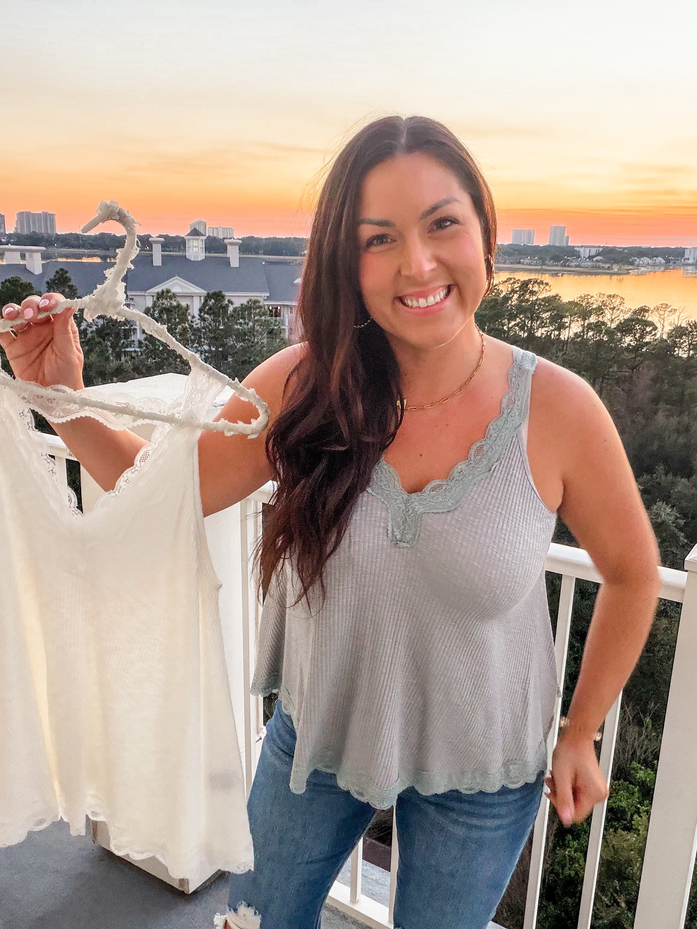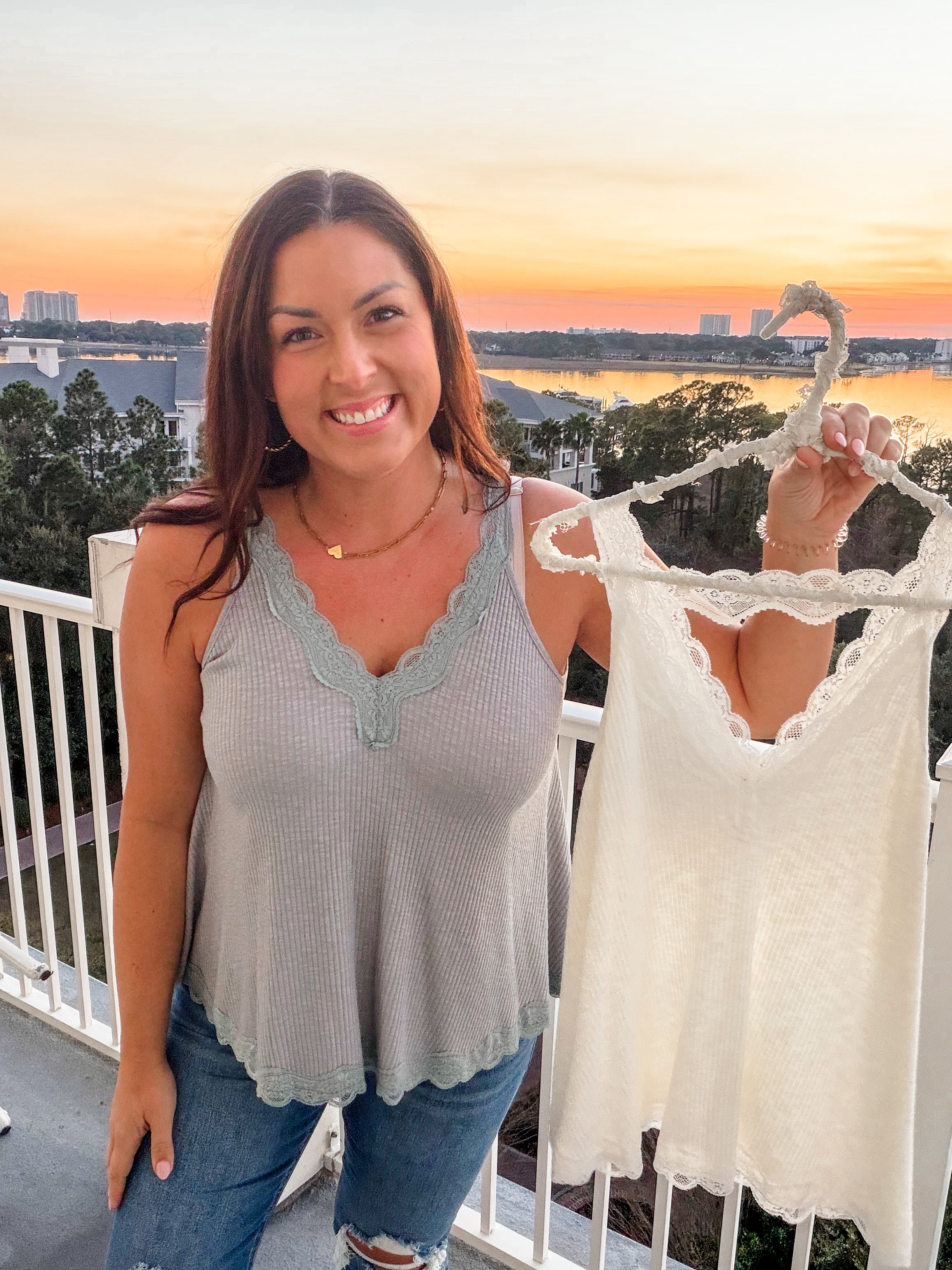 Details: V-neck sleeveless A-line fit rib top with lace detail and pointed solid pattern.