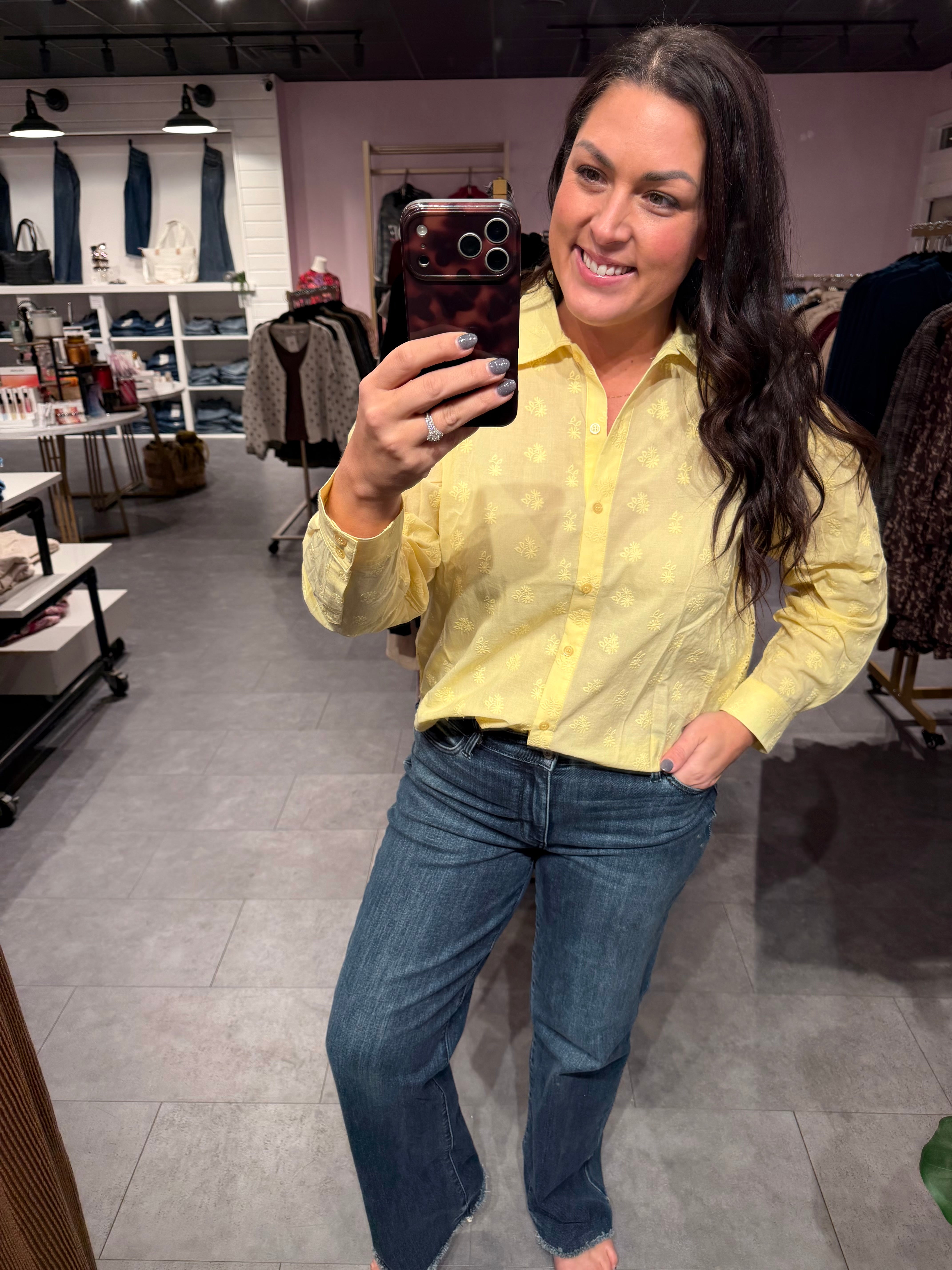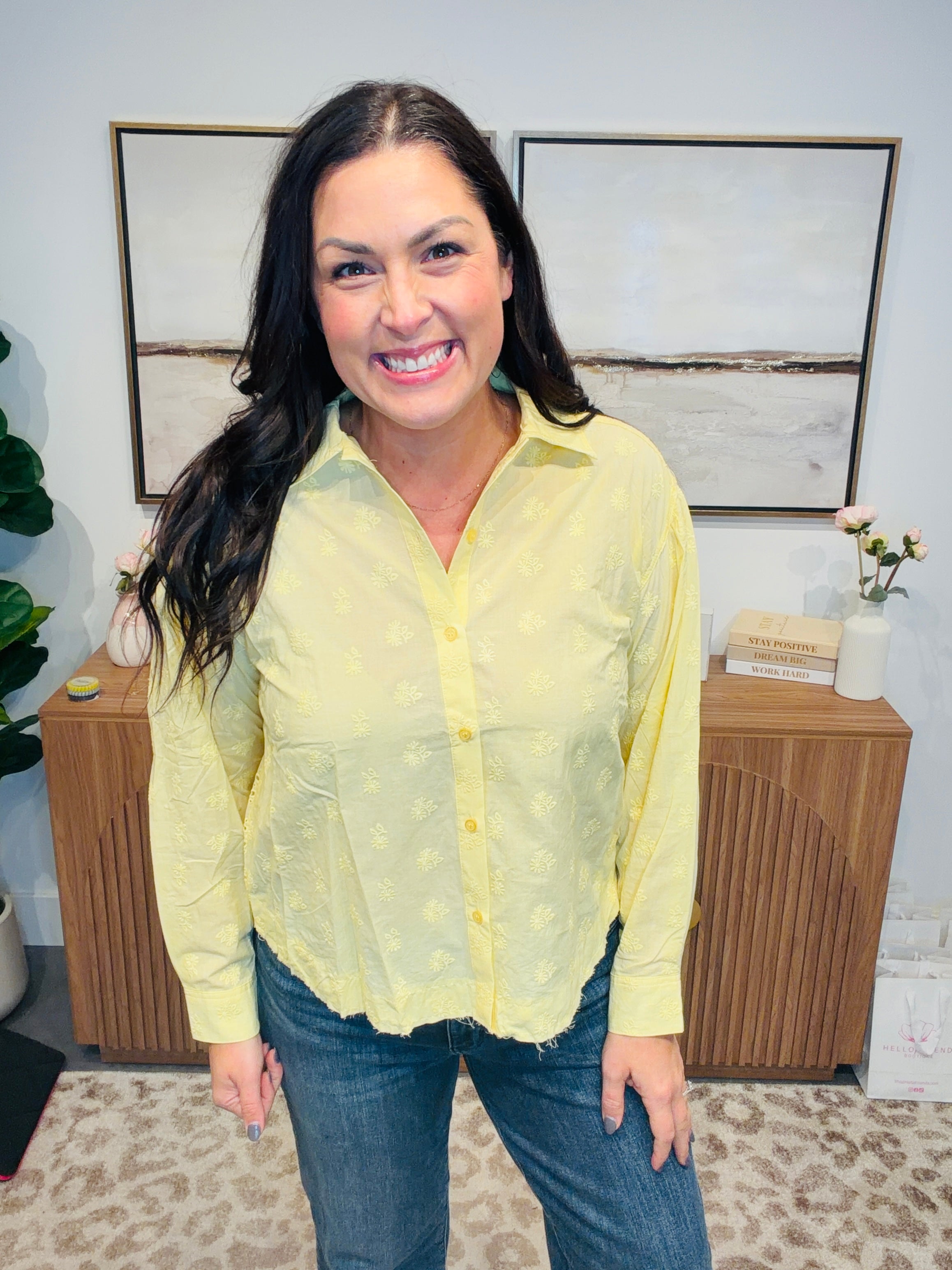 Bring a little sunshine to your wardrobe with our Sunbeam Eyelet Breeze Button Down. This lightweight woven shirt features delicate front eyelet detailing and a bold, airy open-eyelet design in the back—giving you the perfect mix of sweet + statement. Its relaxed, easygoing fit makes it an effortless piece for spring, summer, and beyond.