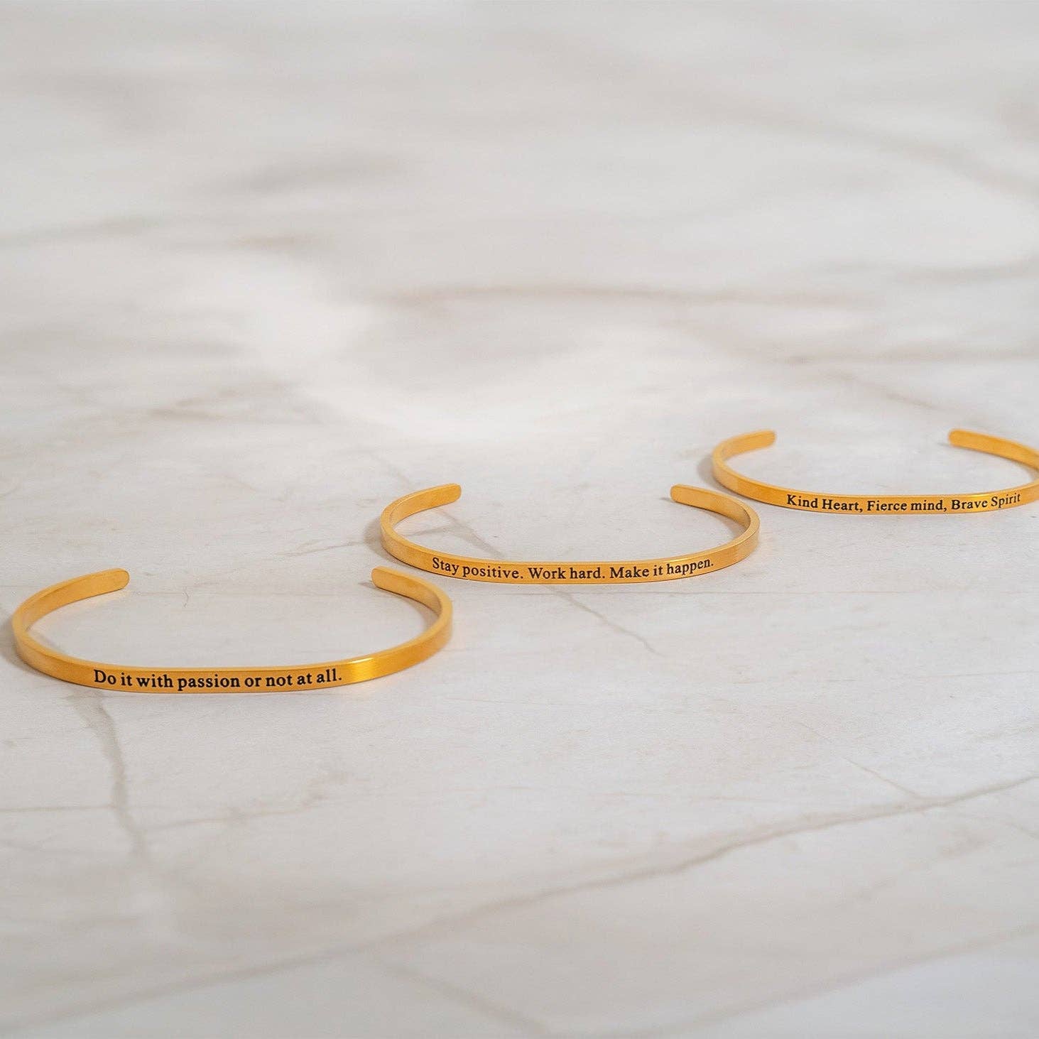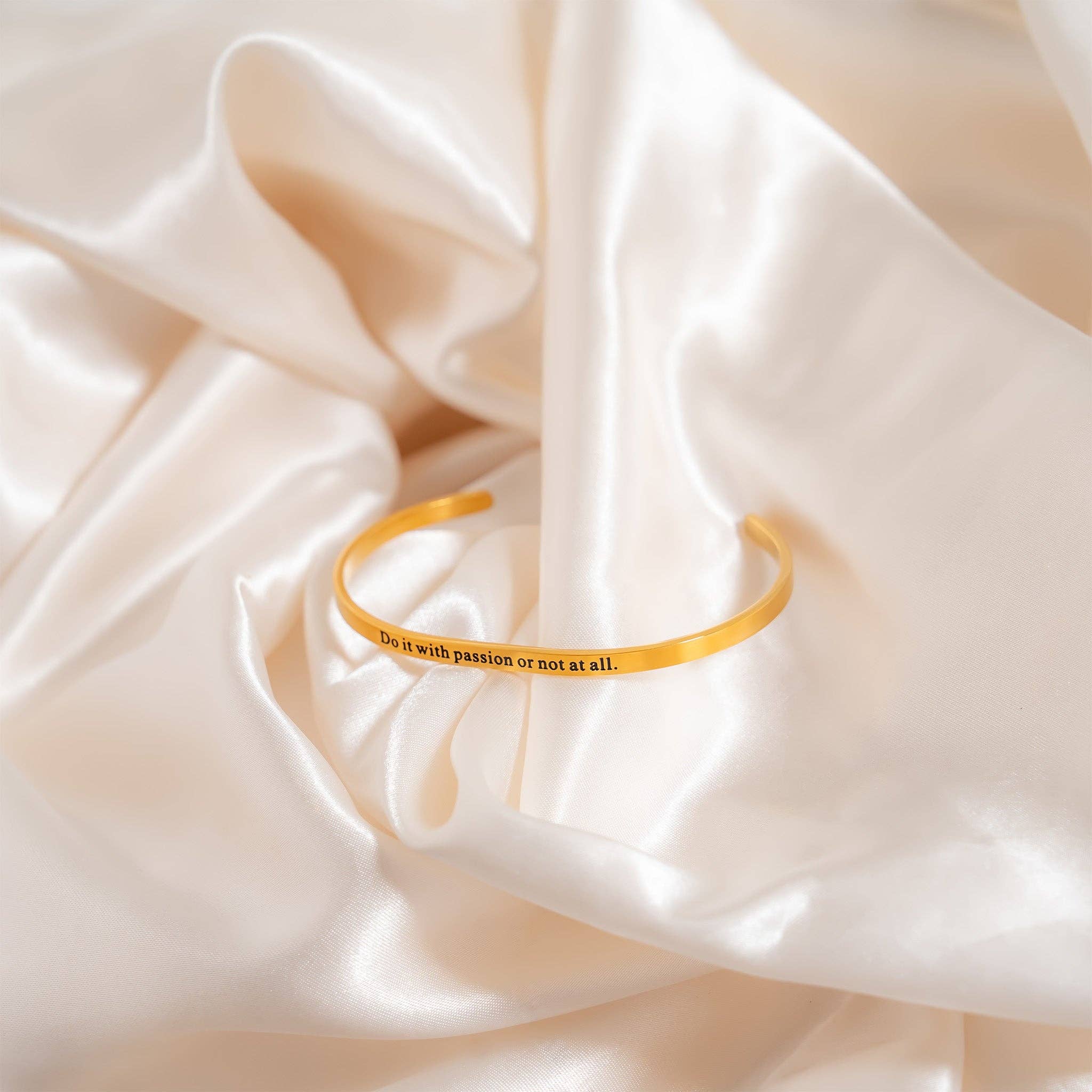 Fuel your day with purpose and style with this empowering bracelet. Crafted from durable stainless steel and finished with a brilliant 18K Gold PVD coating, it’s a timeless reminder to give your all in everything you do. ✦ 100% Waterproof, Non-tarnish, Hypoallergenic ✦ Quality That Lasts ✦ Designed for All Skin Types ✦ Perfect for Every Budget - PVD COATING - We use the process of PVD Coating our 18K Gold jewelry over 316L surgical grade stainless steel for a non-tarnish, hypoallergenic, polished finish that will hold up best to everyday wear and will never turn your customer's skin green. Approx. Dimensions: 2.5" x 2" Approx. Width: 3.5mm Approx. Weight: 7.45 grams Same day shipping from Destin, FL before 3:00 PM CST.