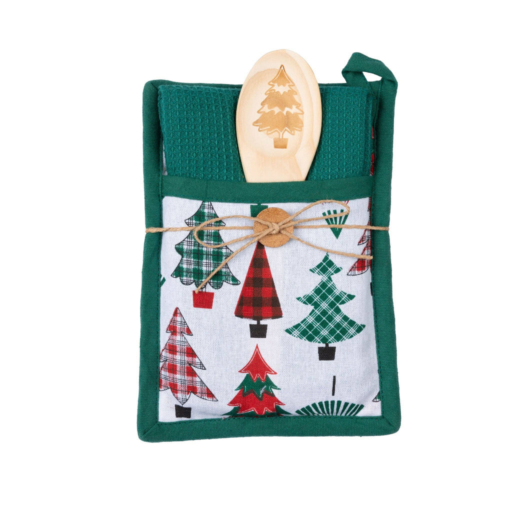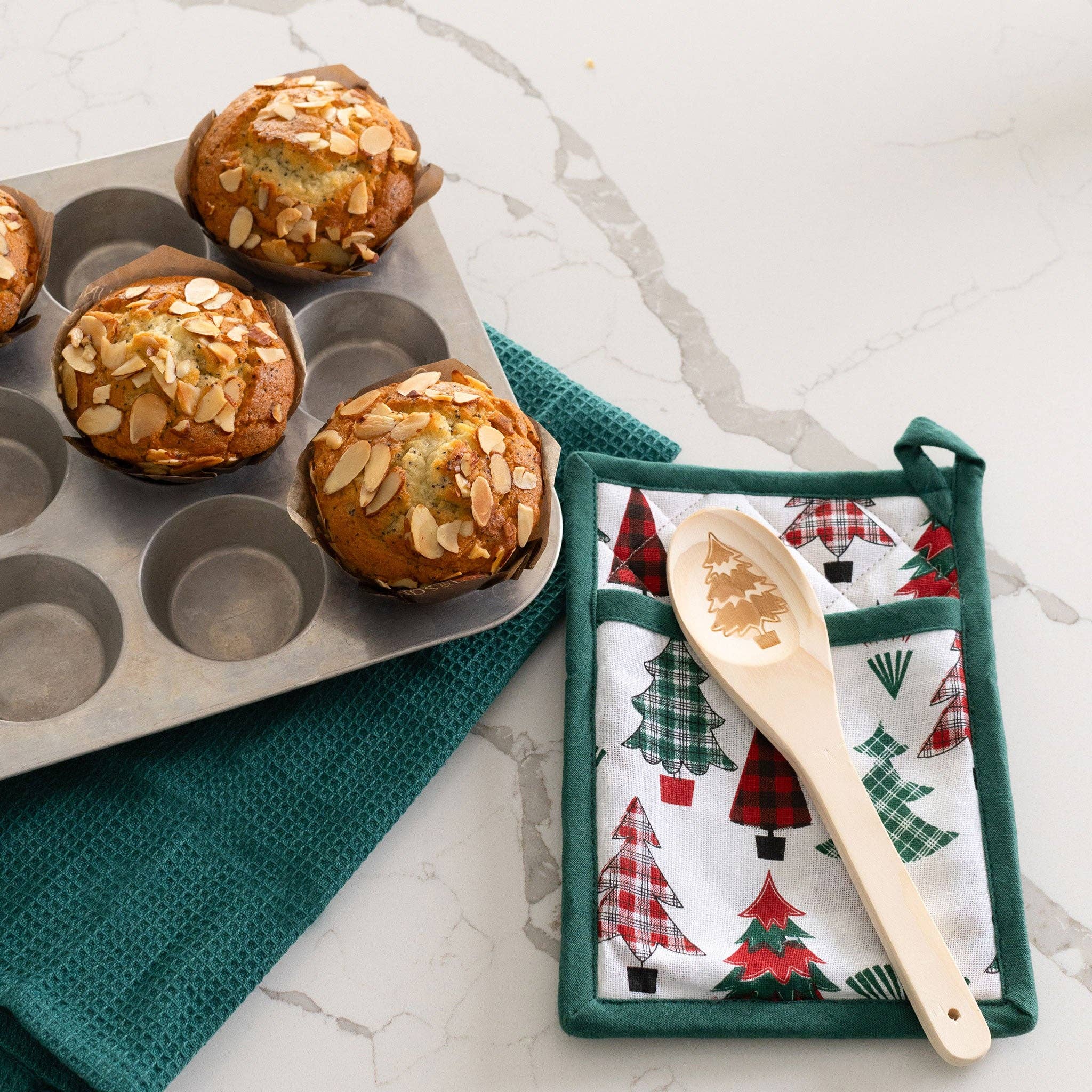 So easy to gift! The 3-Piece Candy Cane Cheer Kitchen Set features a holiday pot holder in a playful red and green Christmas tree print, a coordinating green waffle-knit tea towel, and a wooden spoon with a sweet stamped tree detail. Festive and practical, this cheerful bundle brings the magic of the season right into the kitchen—perfect for gifting, hosting, or adding that extra merry touch to your holiday home.