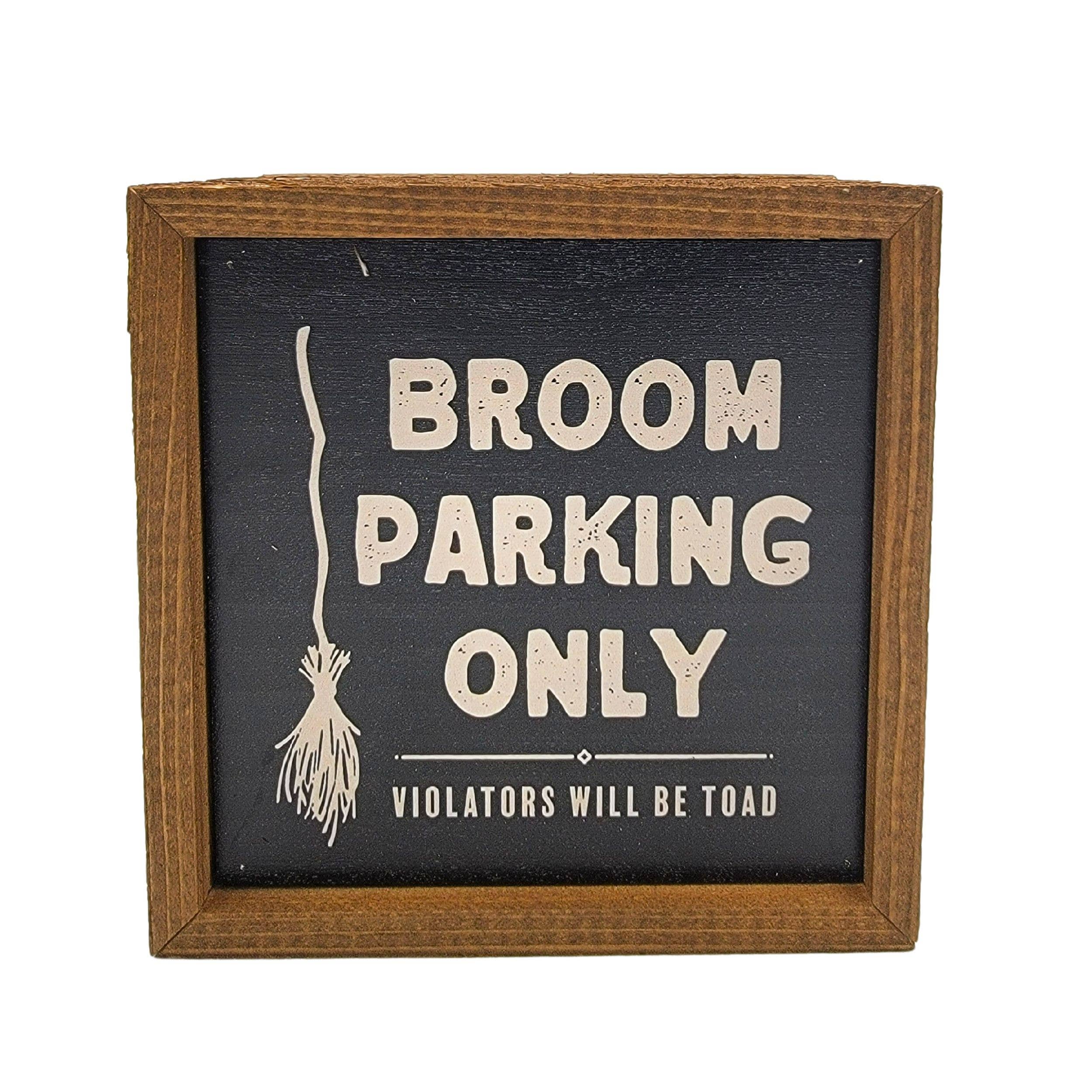 Add a playful and spooky touch to your Halloween décor with this 6x6 wooden box sign. Featuring the cheeky phrase “Broom Parking Only”, it blends rustic charm with modern style, making it a fun accent for any space. Built into a sturdy wooden frame with a rustic finish, this sign can be hung directly from the frame or displayed freestanding on a table, shelf, or mantel.