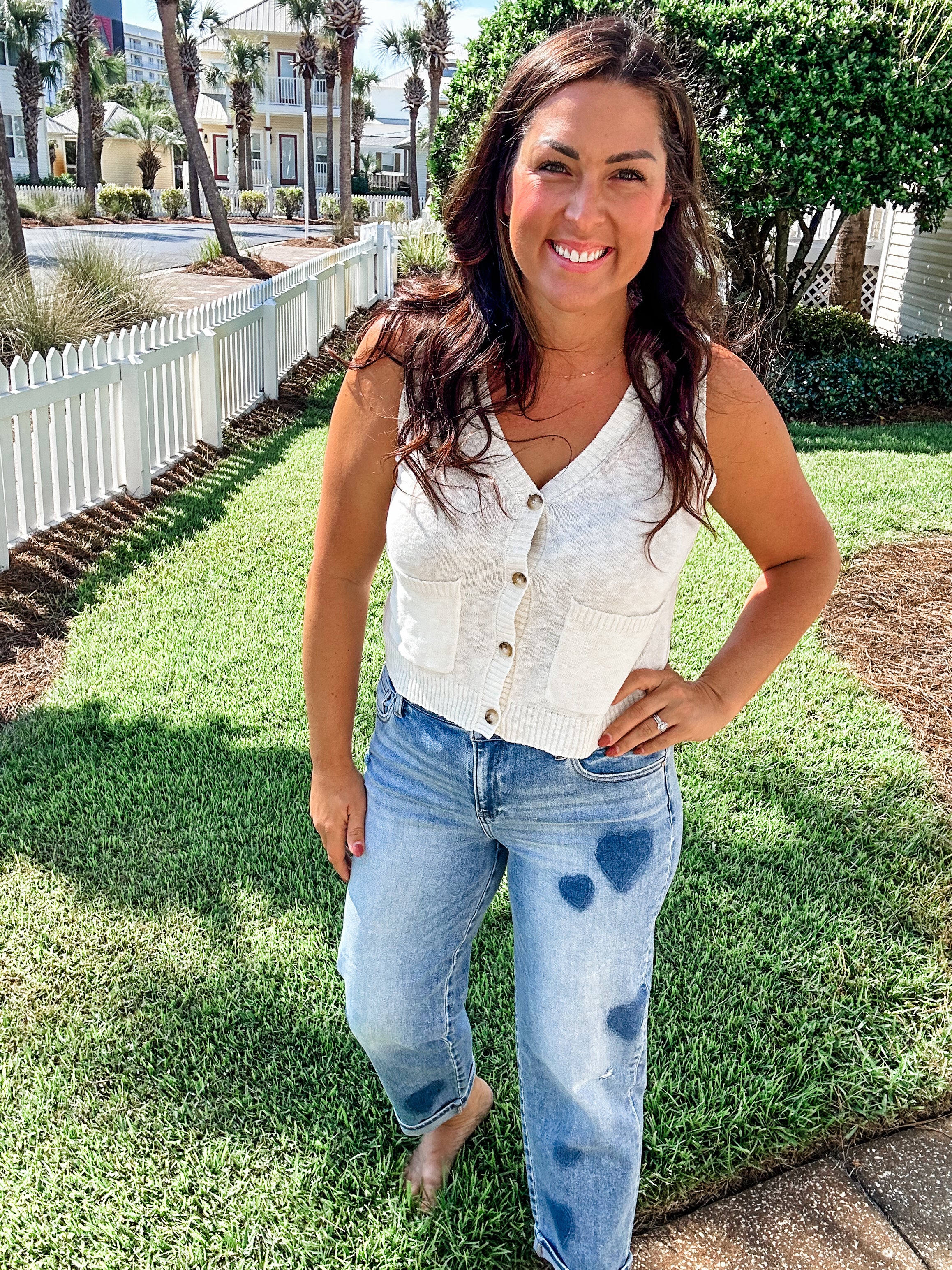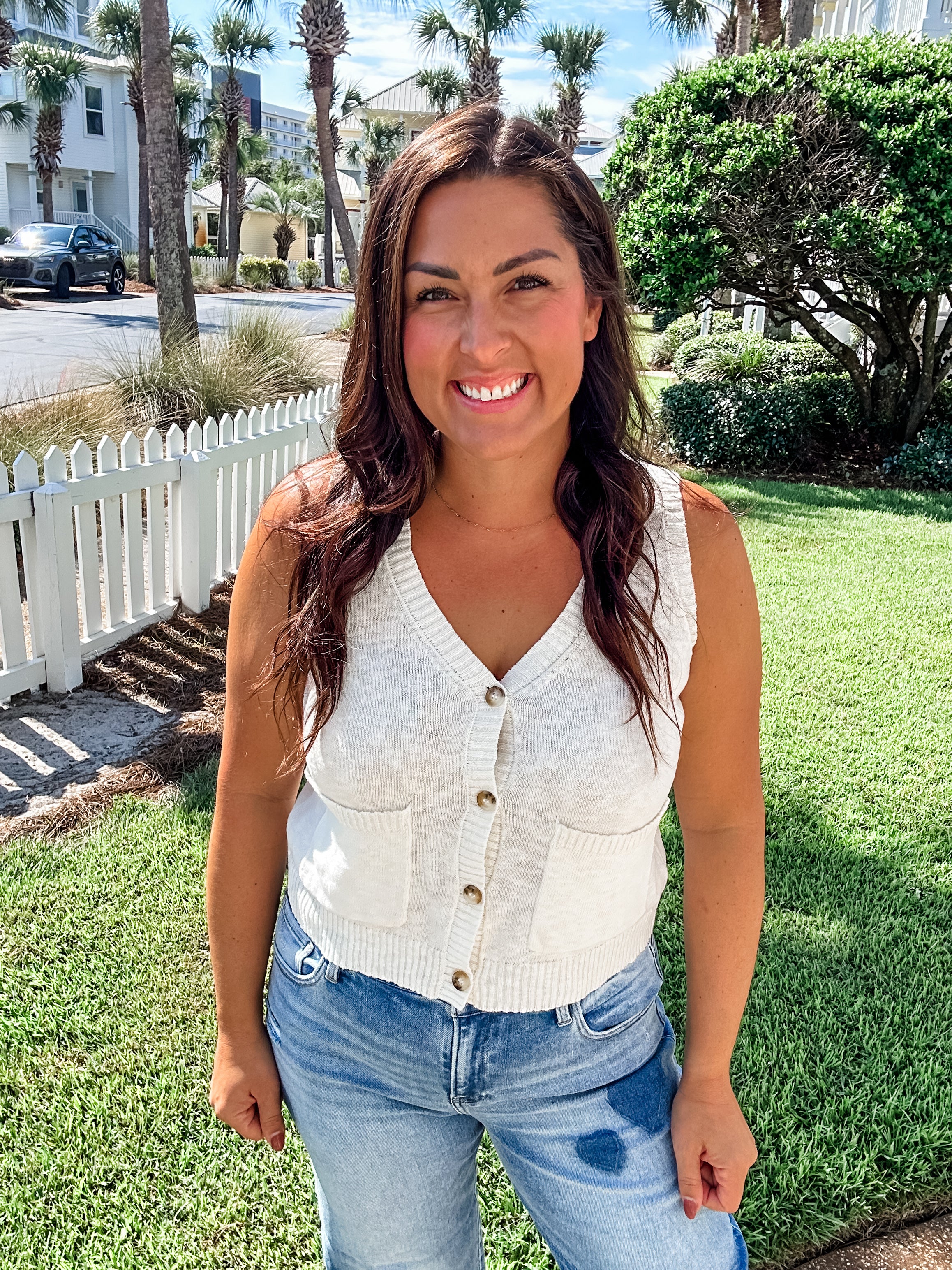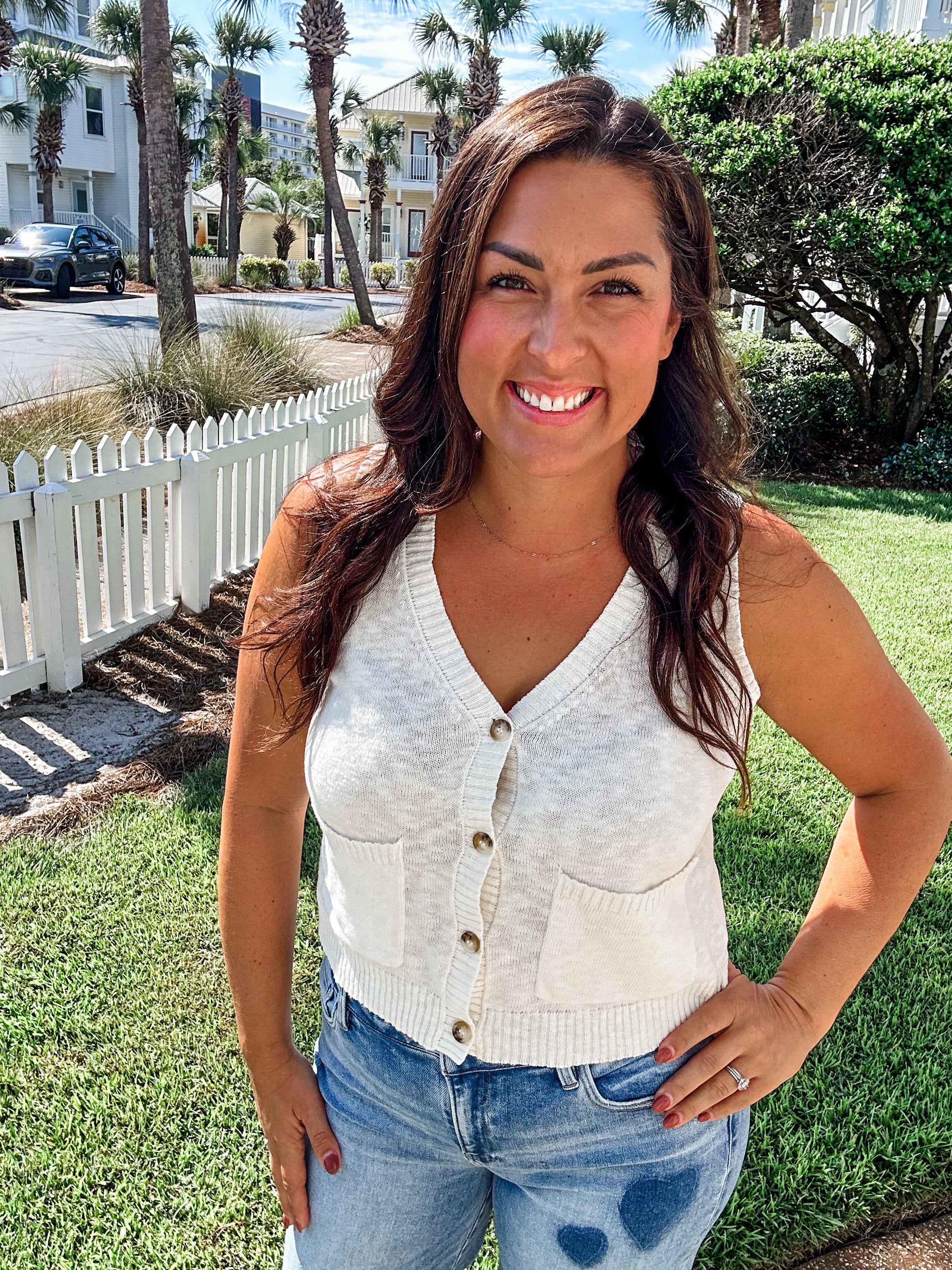 Meet your new go-to neutral: the Turn Back Time Top. This off-white, linen-like knit features a classic button-down front and a relaxed sleeveless silhouette that’s effortlessly chic. Lightweight and breathable, it’s the perfect elevated basic for layering or wearing solo on warm days.