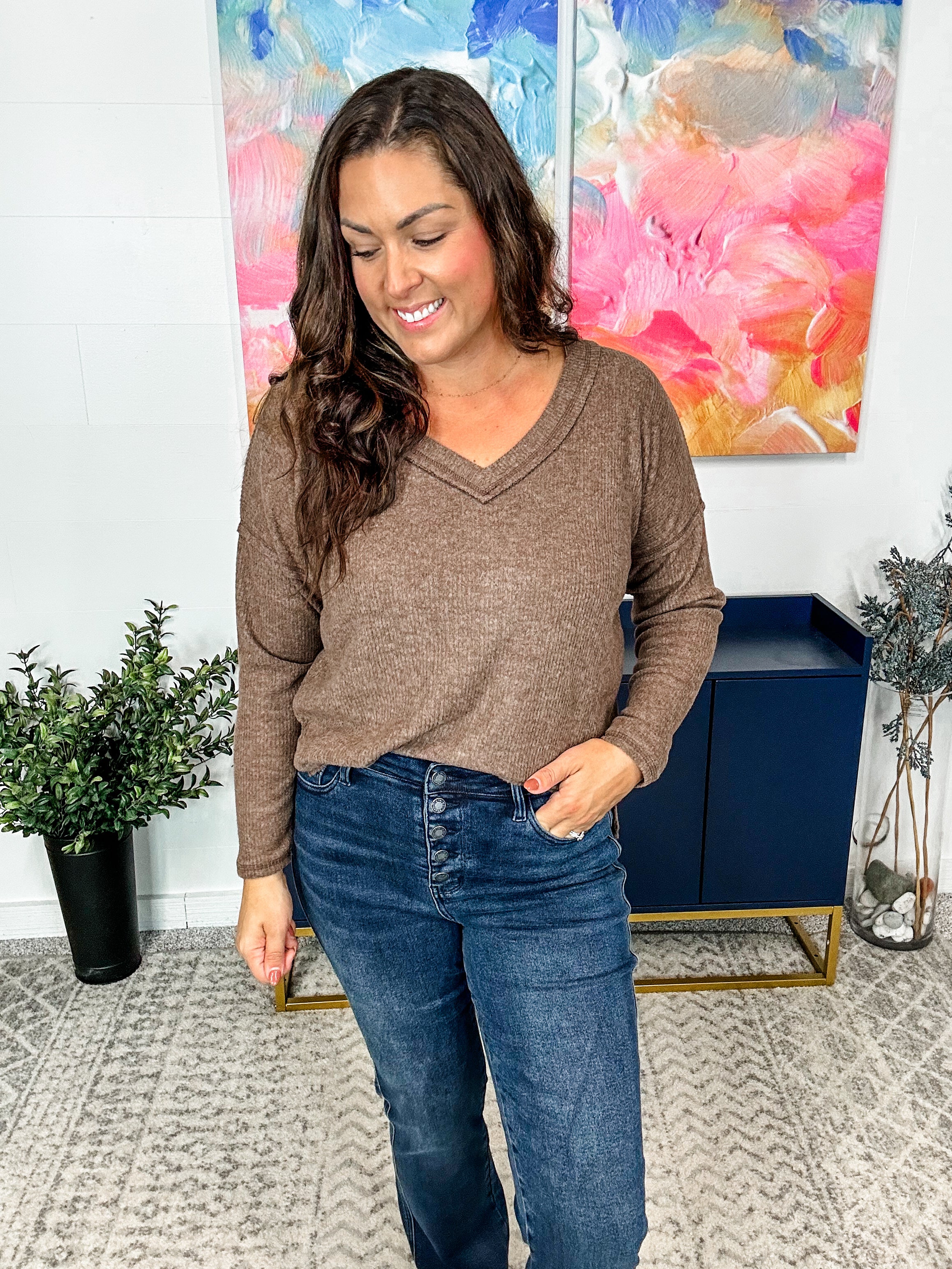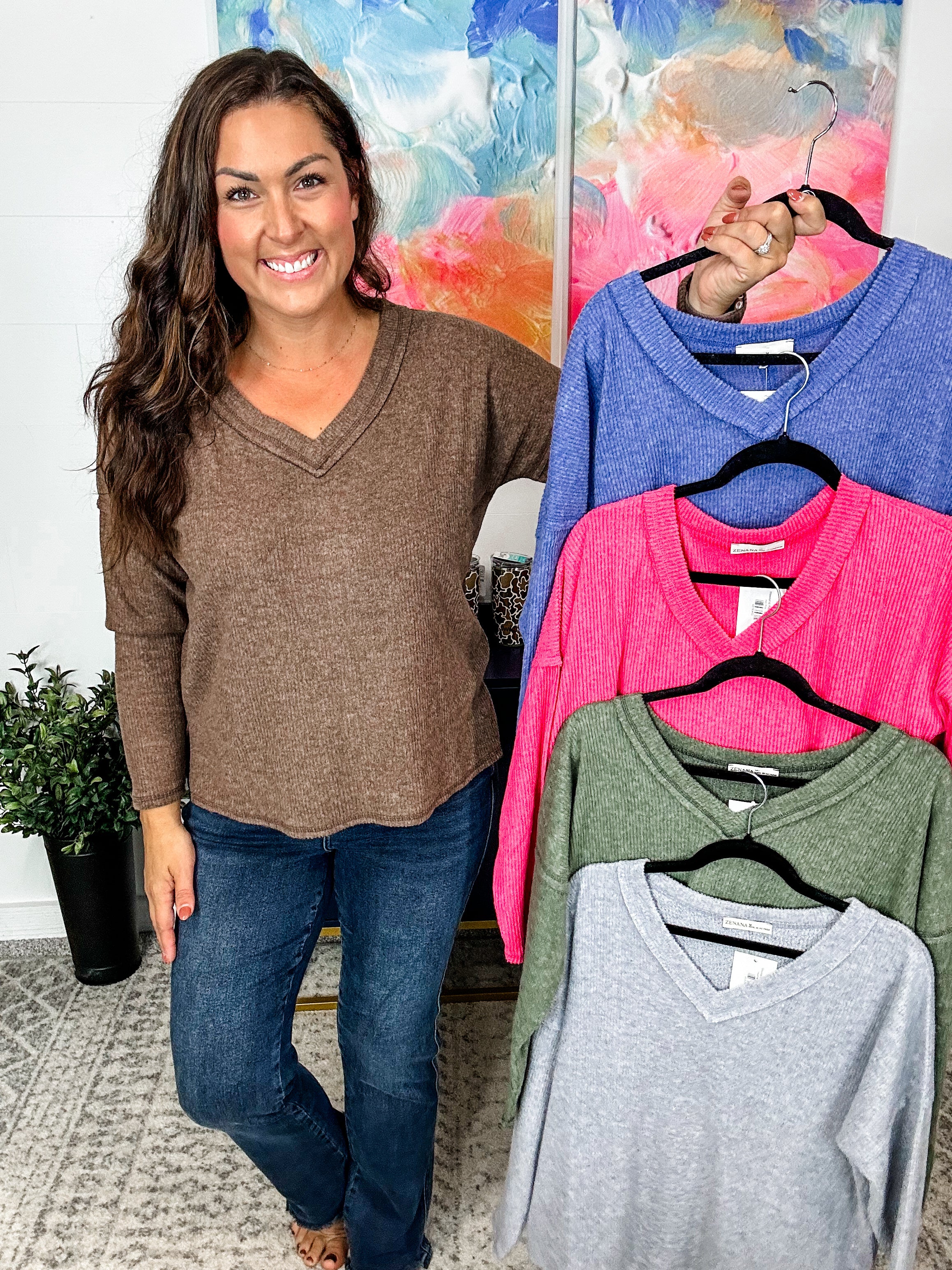 Slip into comfort with a touch of polish in the Ribbed V-Neck Drop Shoulder Top. Crafted from a brushed ribbed knit, this piece offers the perfect blend of softness and stretch. The drop shoulder design gives it a relaxed, laid-back vibe, while the flattering V-neckline adds a feminine touch. Whether you’re lounging at home, layering for work, or styling up for a casual outing, this top moves with you in effortless style.