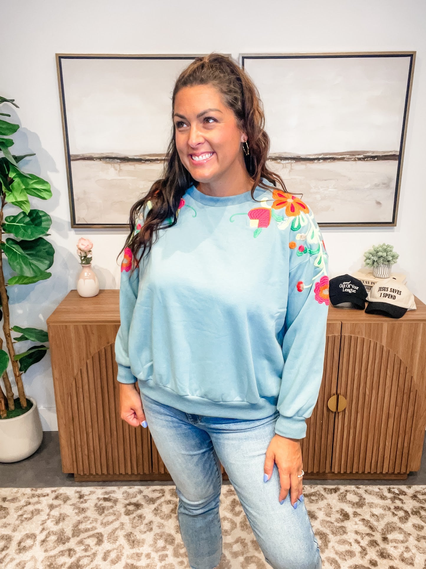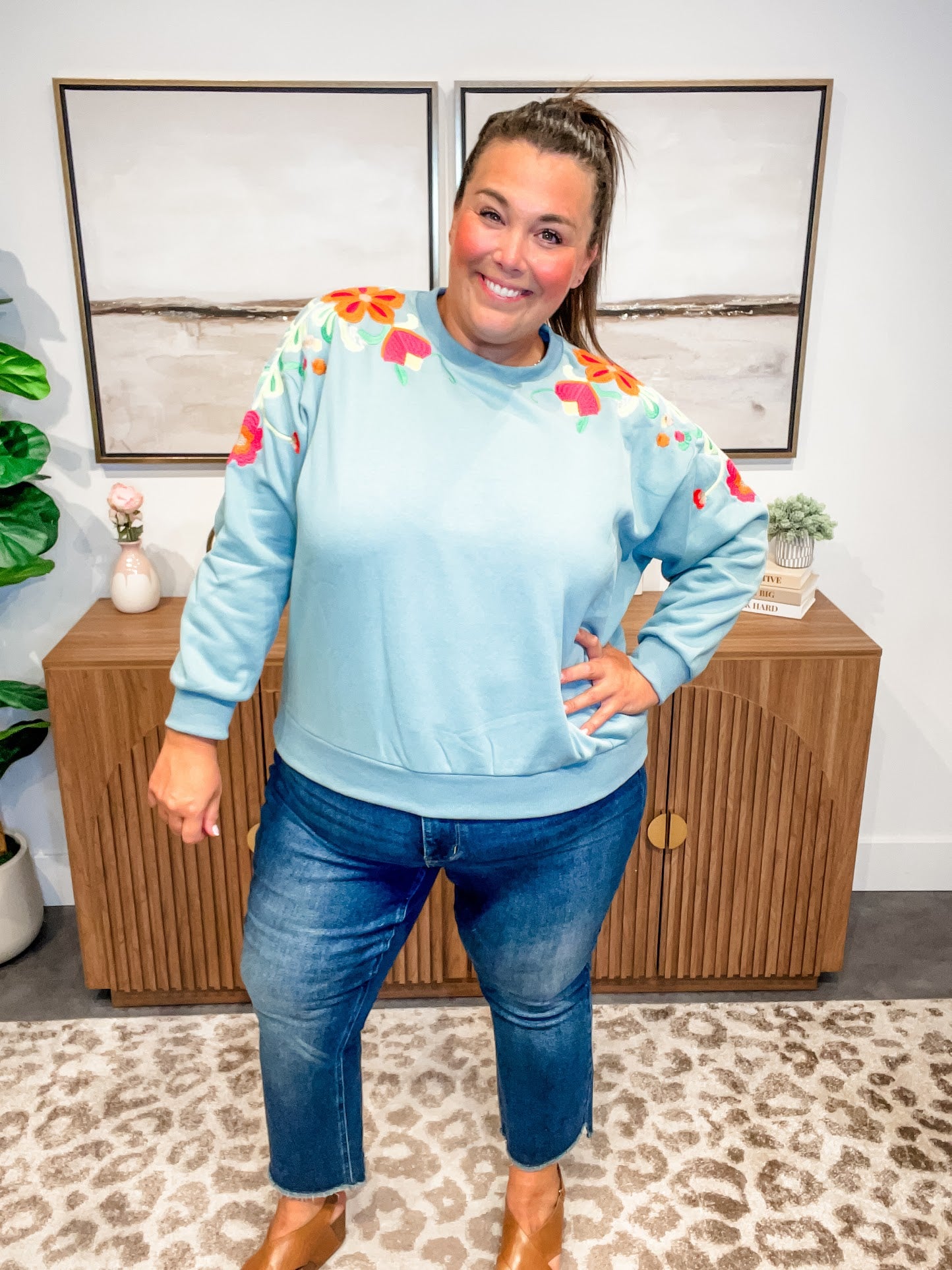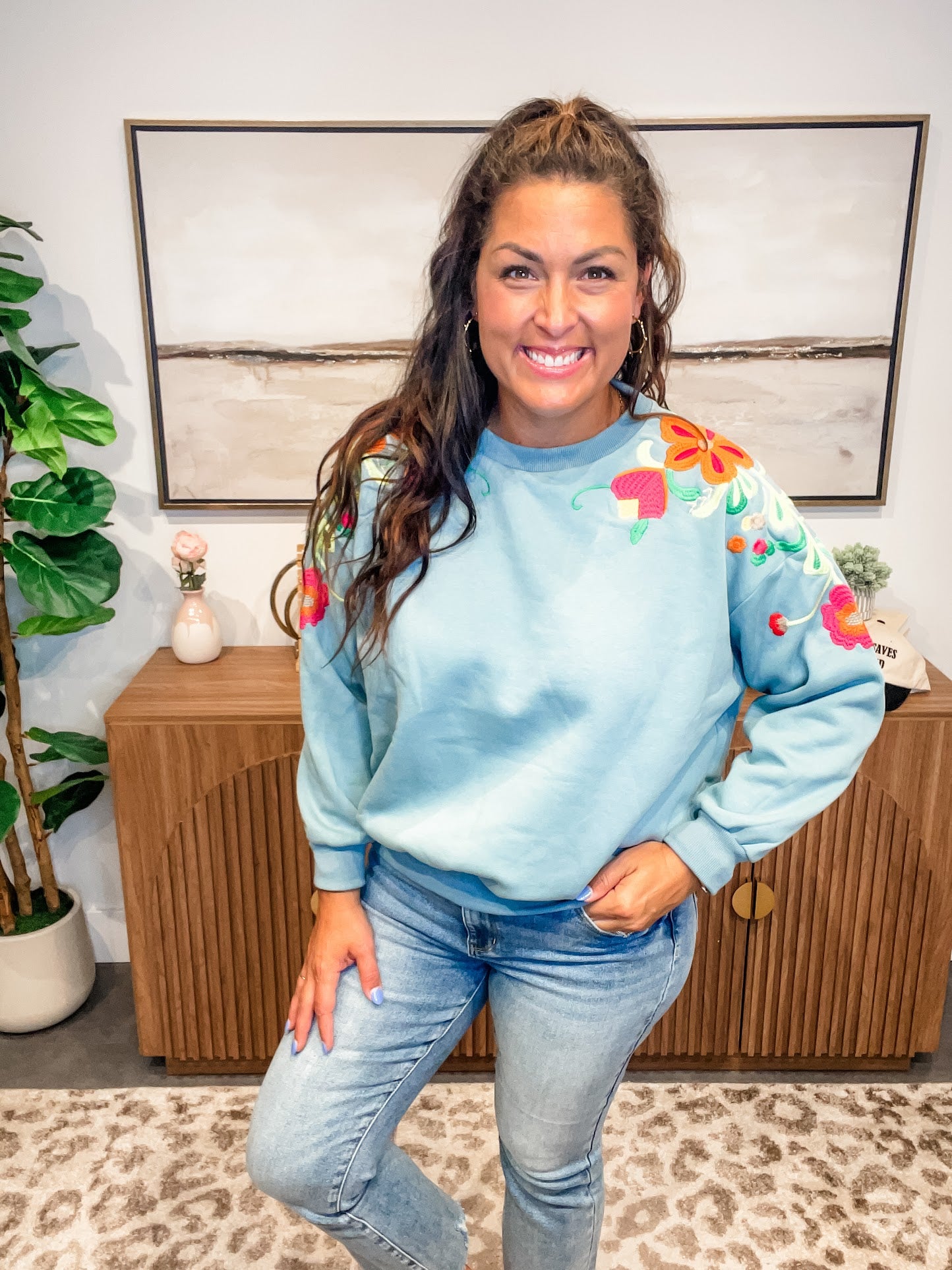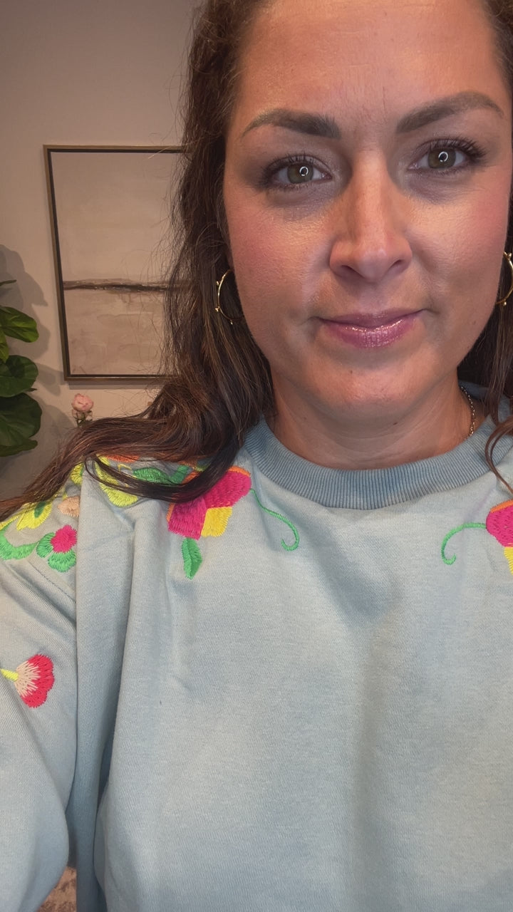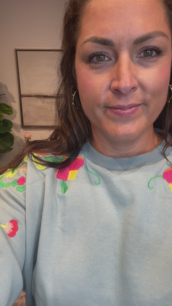 Delicate meets cozy in the Wildflower Whimsy Pullover — a slate-colored long sleeve crewneck featuring soft floral embroidery that dances from the shoulder down the sleeve. Feminine without being fussy, this elevated basic brings a touch of nature-inspired charm to your everyday wardrobe.