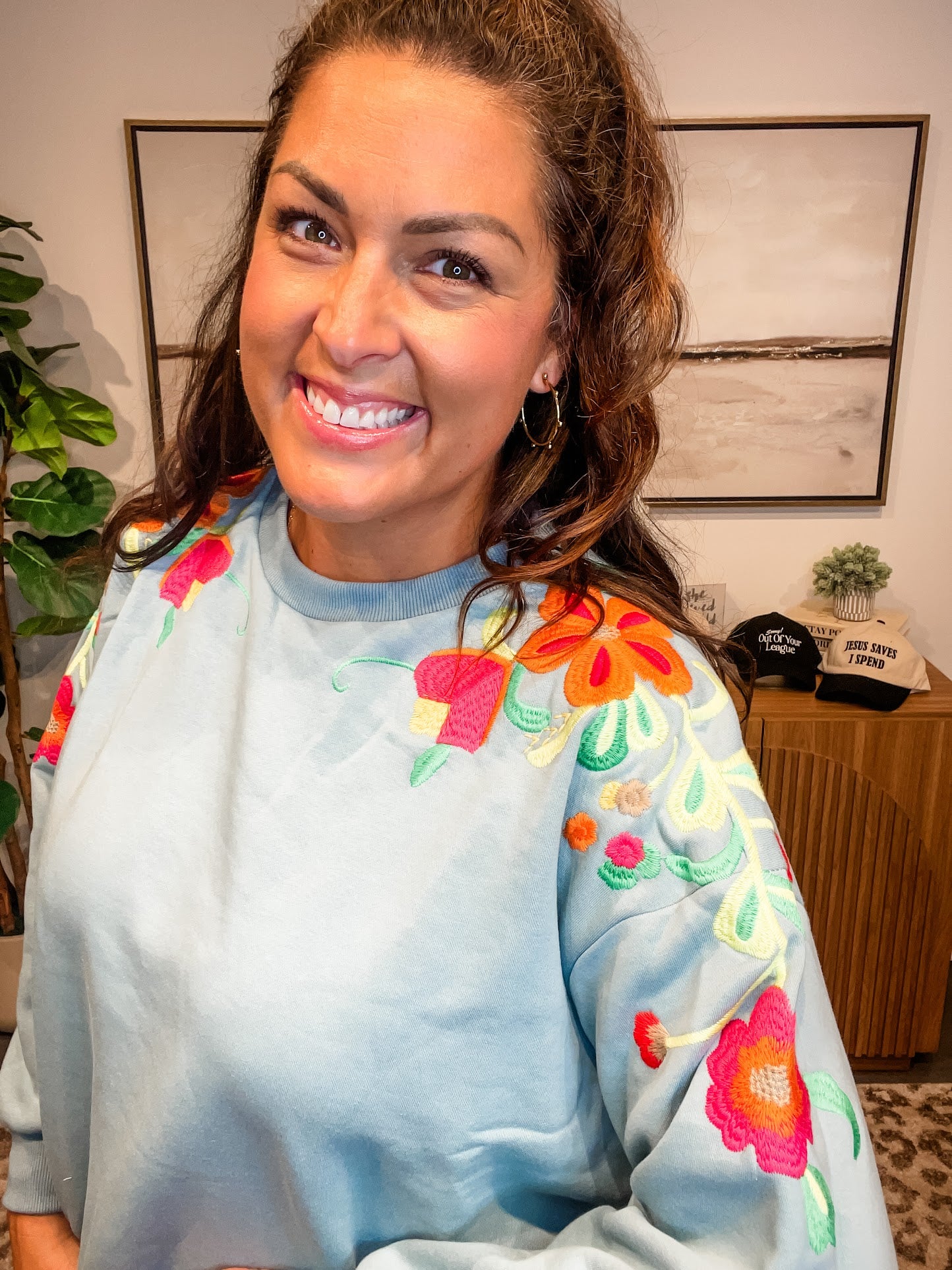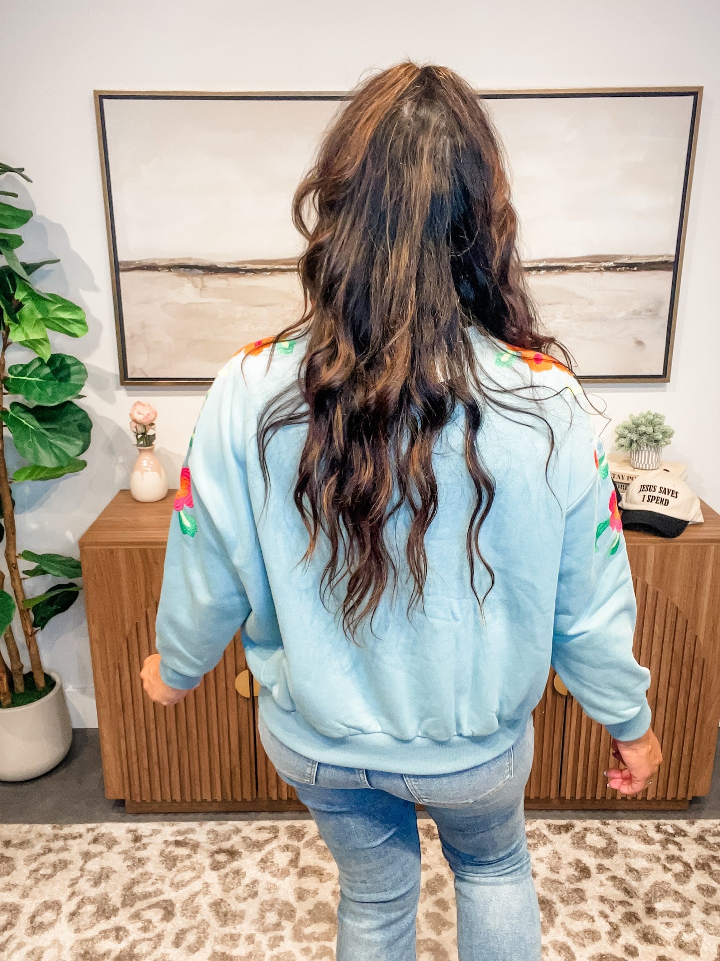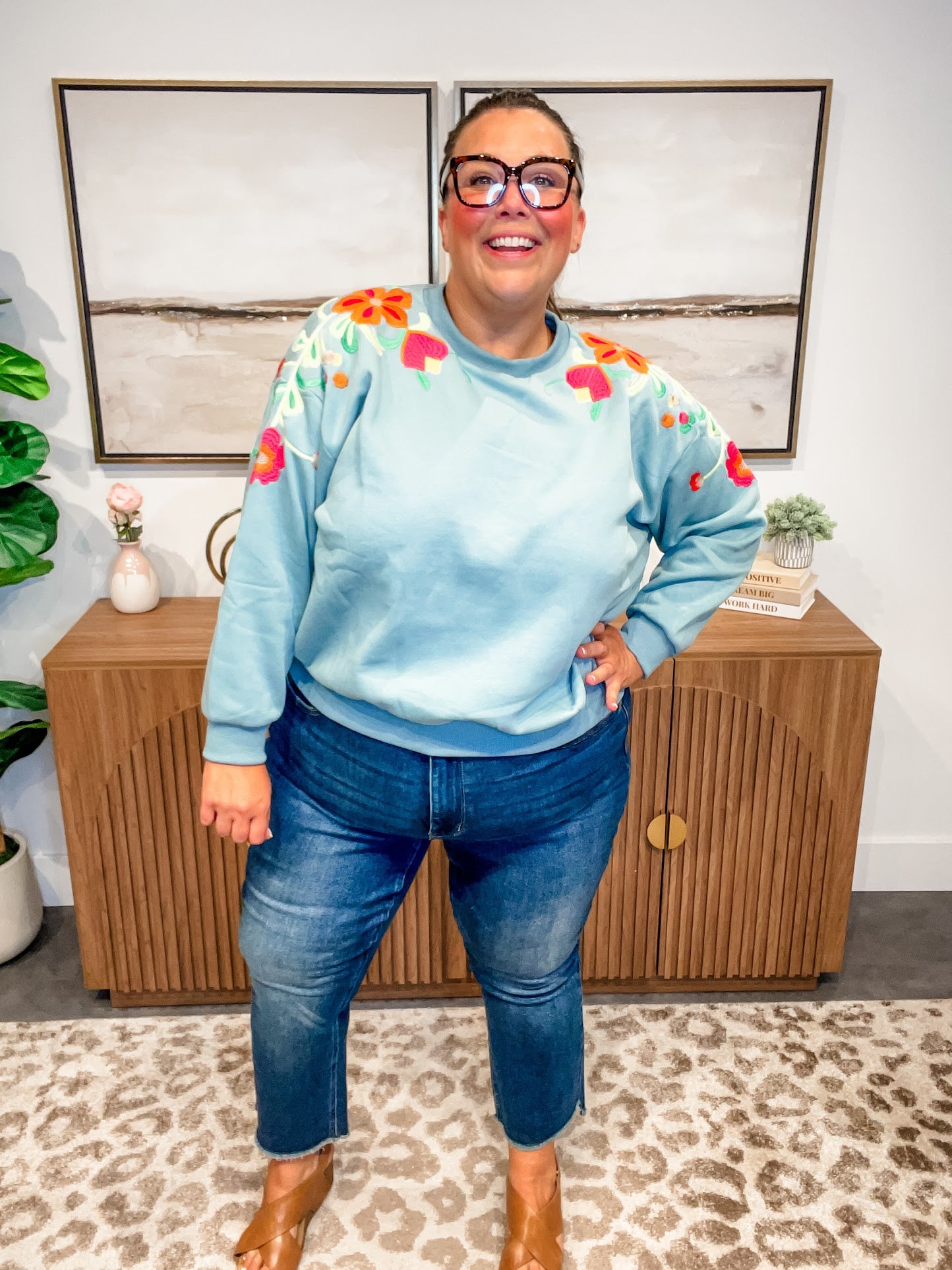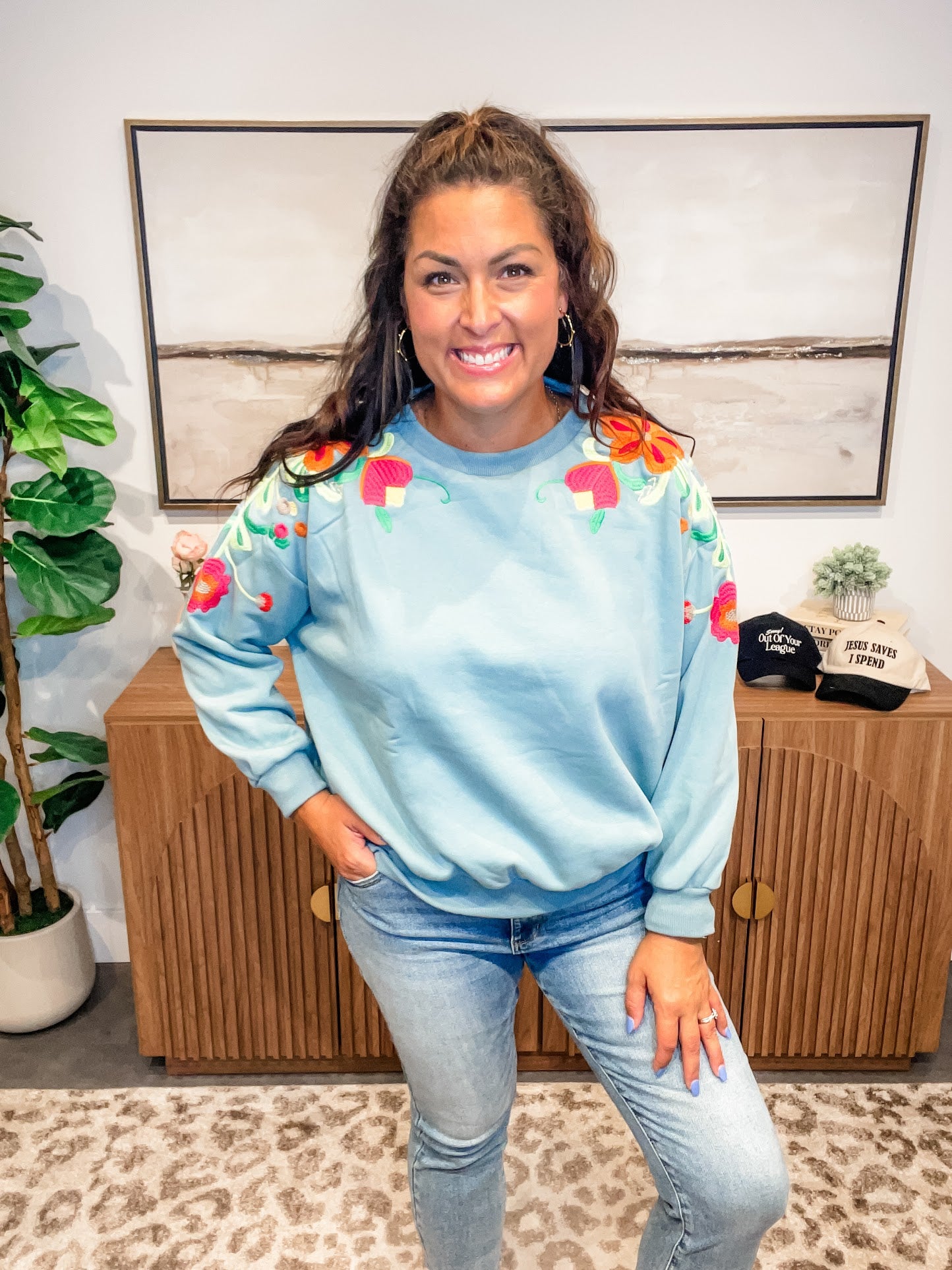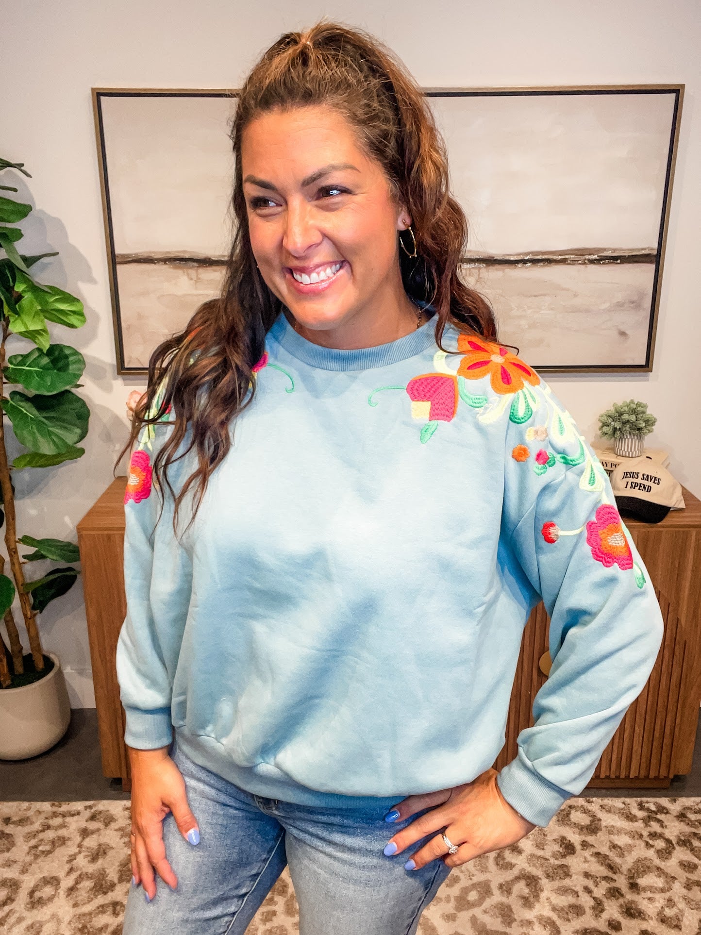 Delicate meets cozy in the Wildflower Whimsy Pullover — a slate-colored long sleeve crewneck featuring soft floral embroidery that dances from the shoulder down the sleeve. Feminine without being fussy, this elevated basic brings a touch of nature-inspired charm to your everyday wardrobe.