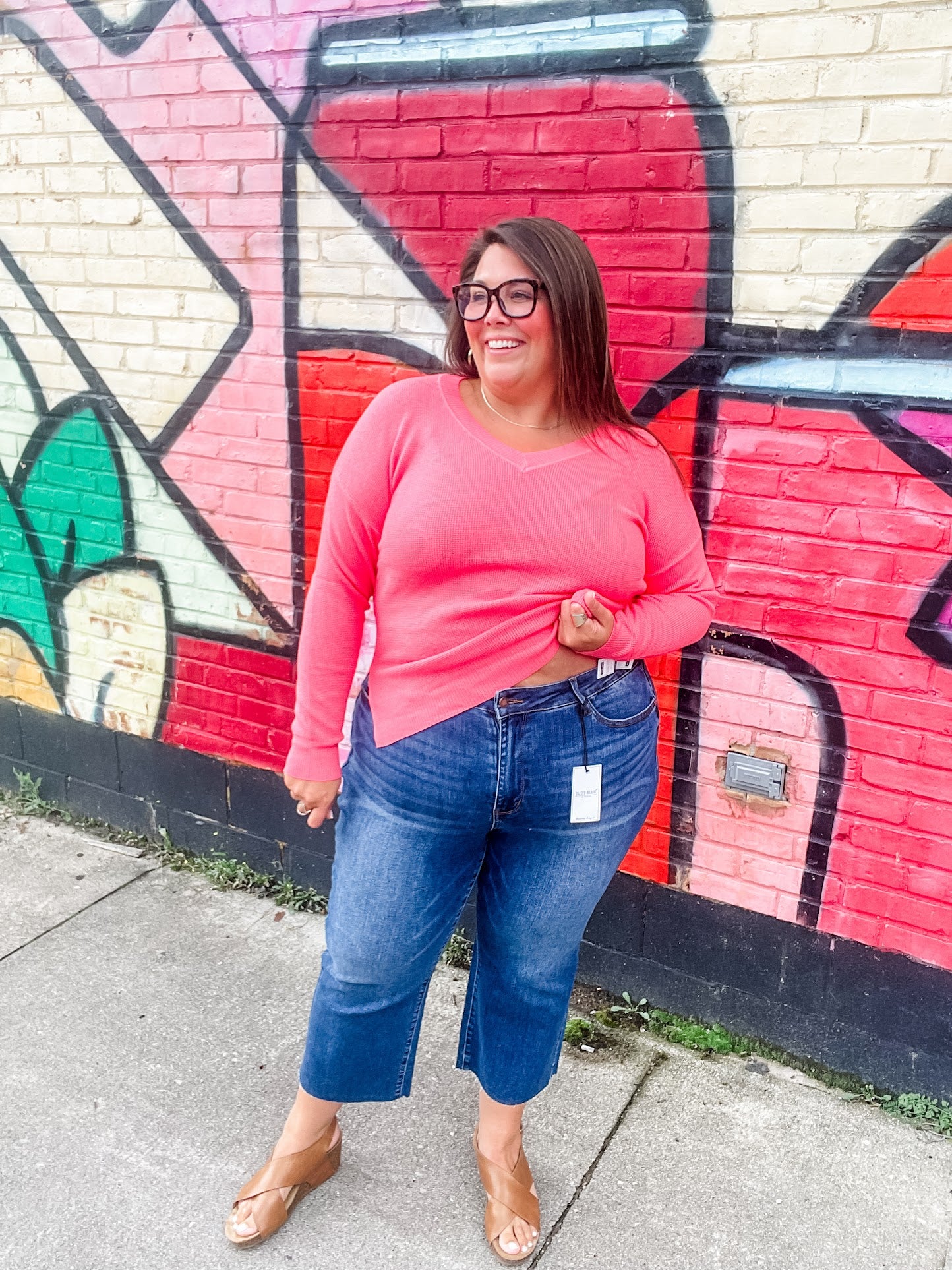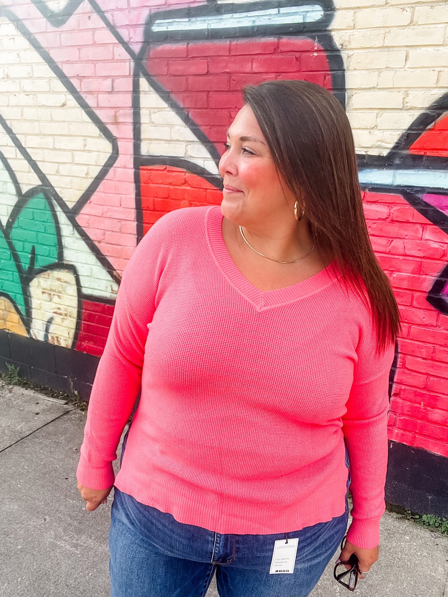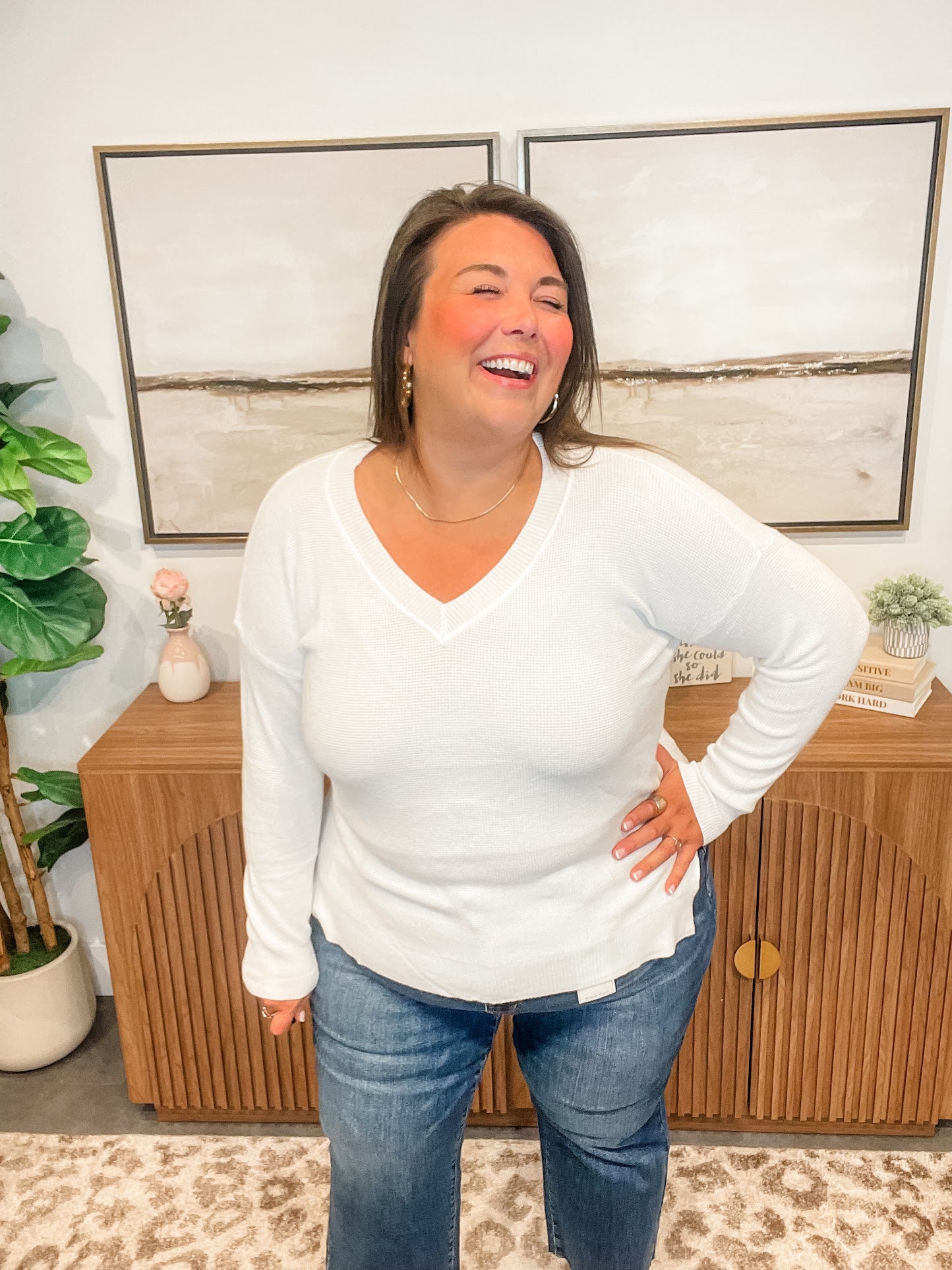 Get cozy in elevated style with our Waffle Knit V-Neck Sweater, crafted from a soft fine gauge blend for a lightweight yet luxurious feel. The subtle waffle texture adds dimension, while the relaxed fit and side slits offer easy movement and a flattering drape. Perfect for layering or lounging, this sweater is your new seasonal staple.